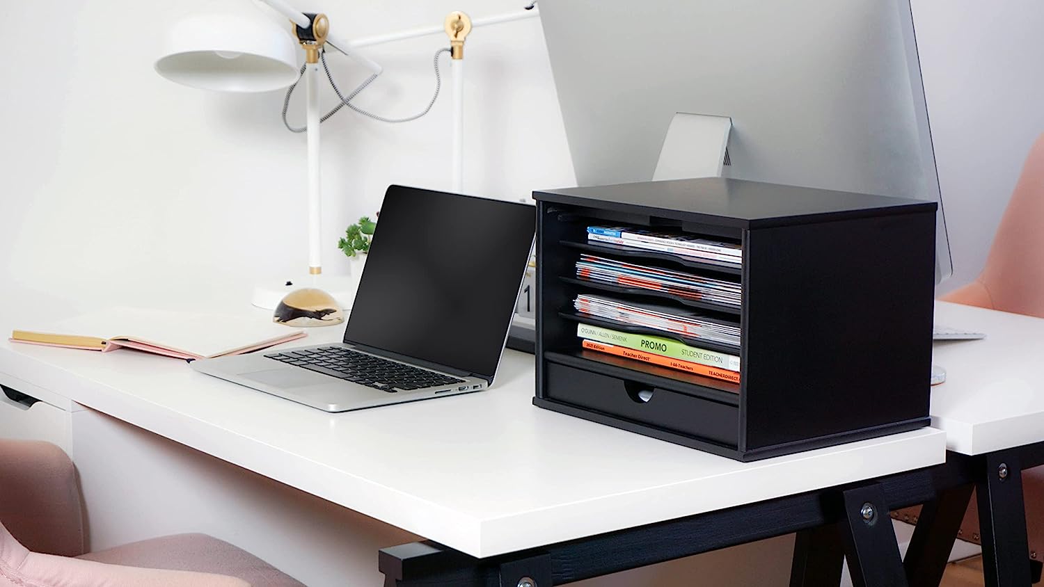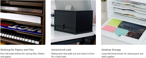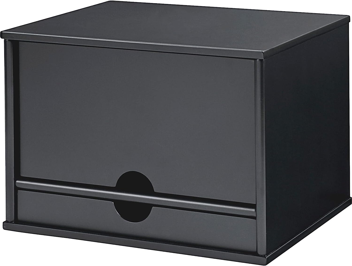 The Victor Midnight Black Collection brings a fresh perspective to desk accessories by offering functional solutions with appealing design elements. The 4720-5 Desktop Organizer provides four shelves and one large drawer for flexible storage of files and desk supplies. The sliding door on top pulls out and closes in front to easily hide contents when you want a clean look. Combine two or more Desktop Organizers to create an elegant literature rack or storage system. Features sturdy 11.9 lb. wood construction with a durable double coated matte black finish. Stylish 14" x 10.75" x 9.75" design with crown molding base makes a great addition to any desk. Perfect for use either at home or in the office. Enter the search term “Victor Midnight Black Collection” to see the entire lineup including: Corner Shelf, Printer Stand, Stacking Letter Tray, Business Card Holder, Monitor Riser, Magazine Holder, Tidy Tower, Incline File, Reversible Book End, Pencil Cup with Note Holder.