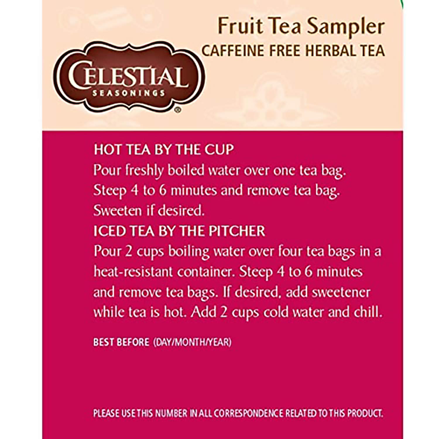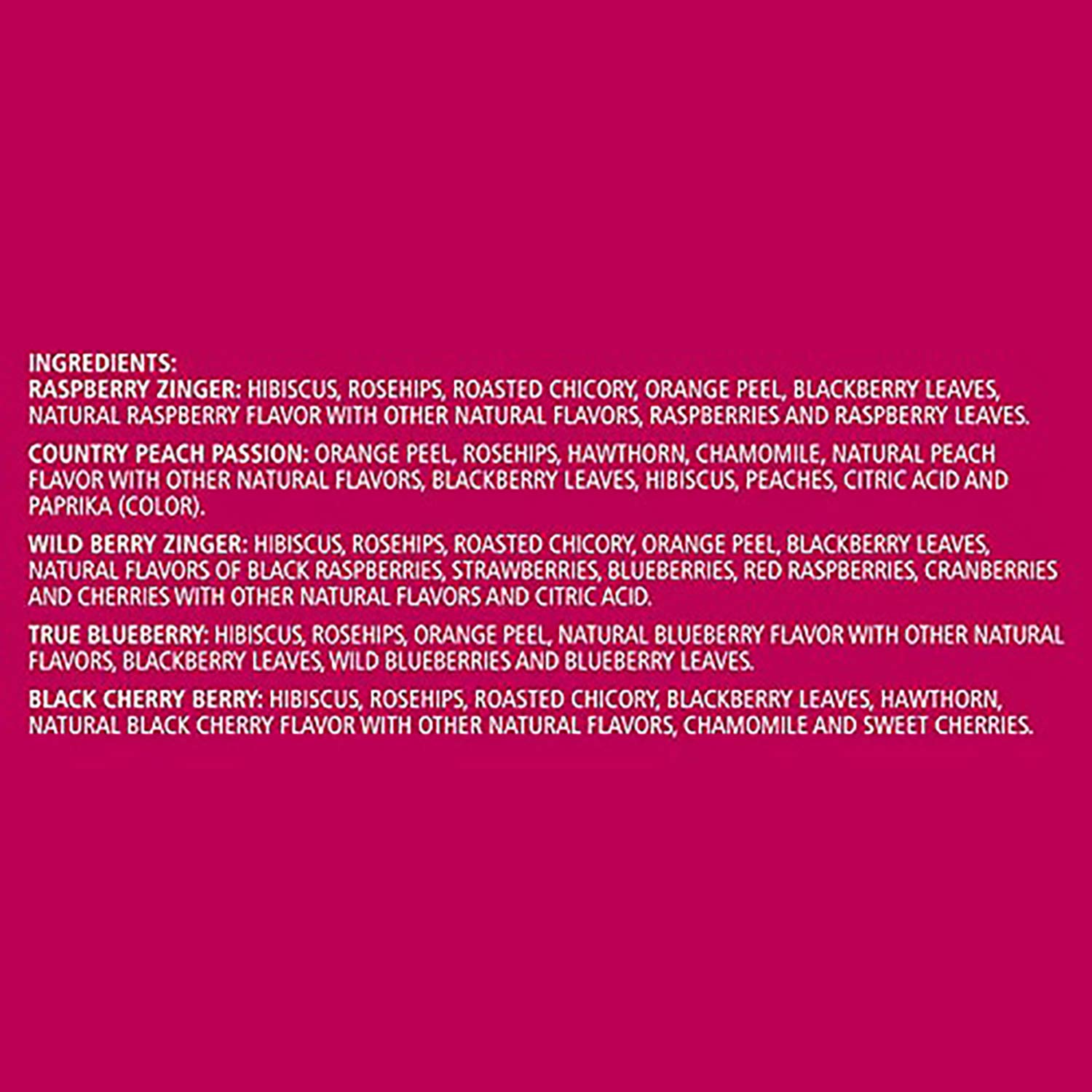 Contains Raspberry Zinger, Country Peach Passion, Wild Berry Zinger, True Blueberry & Black Cherry Berry