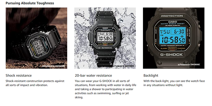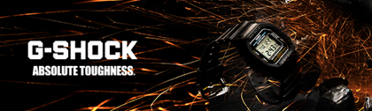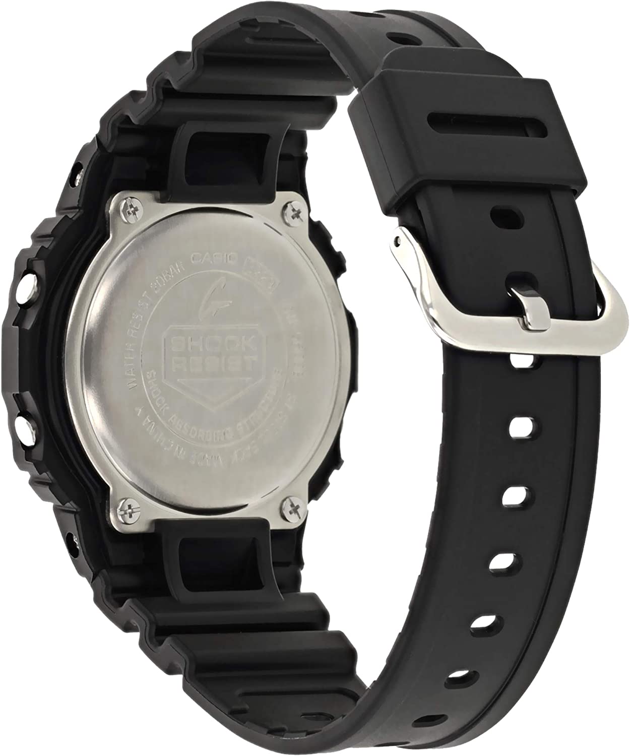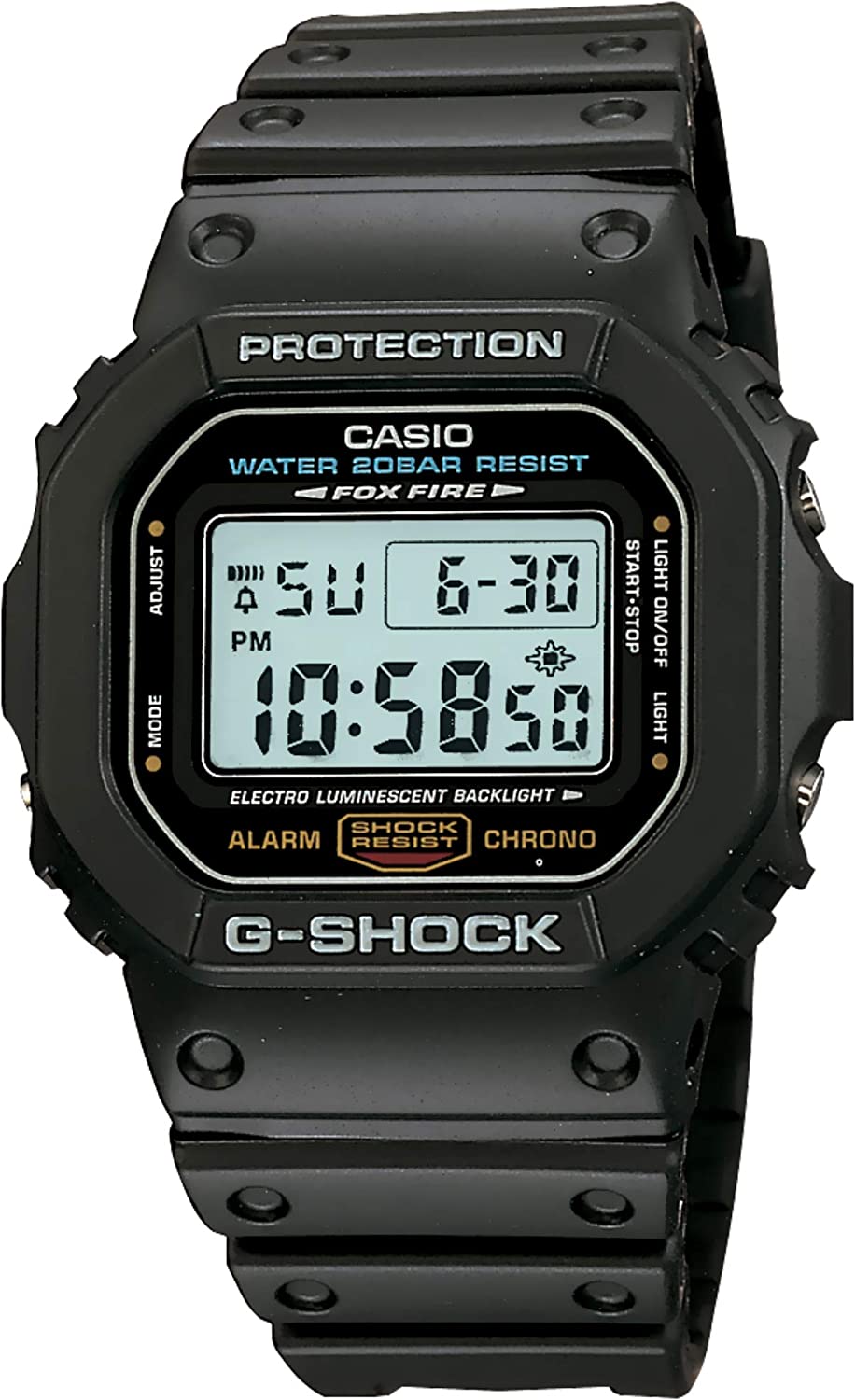 The simply designed Casio G-Shock Classic digital watch for men offers shock resistance that's great for your most vigorous sporting activities. The durable rectangular black watch case measures 45mm wide (1.77 inches), and it's matched to a comfortable black resin sports strap. It includes a stopwatch function that can measure events down to 1/100 of a second for the first 60 minutes (and down to 1 second from 60 minutes to 24 hours), and it offers elapsed and split time modes, and 1st-2nd place times. It also has a countdown timer with a 24-hour range. Other timekeeping features include a multi-function alarm, hourly time signal (which can be turned off), and 12/24-hour formats. This timepiece also features an Auto Calendar (pre-programmed until the year 2039), ±15-second accuracy per month, Afterglow backlighting, and water resistance to 200 meters (660 feet)--which will stand up to the rigors of recreational scuba diving.