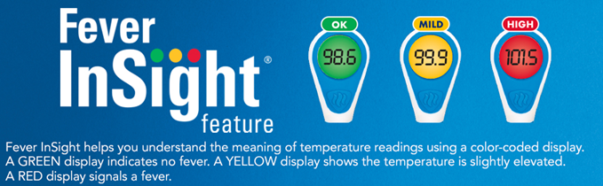 - EASY TO READ – The color coded Fever InSight helps get temperature readings at a glance, and understand them easily. A green display suggests a normal temperature, yellow signifies an elevated temperature and a red display indicates a high temperature