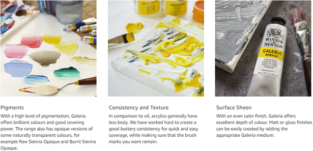 Winsor & Newton Galleria Acrylic Color is a high quality acrylic which delivers professional results and is ideal for artists who want good quality color at an affordable price. All of the colors in the Galleria Acrylic range offer a wide spectrum of pigment characteristics to choose from as well as excellent brilliance of color, high levels of pigment strength, opacity & permanence, strong brush stroke retention, clean color and a smooth, satin finish.