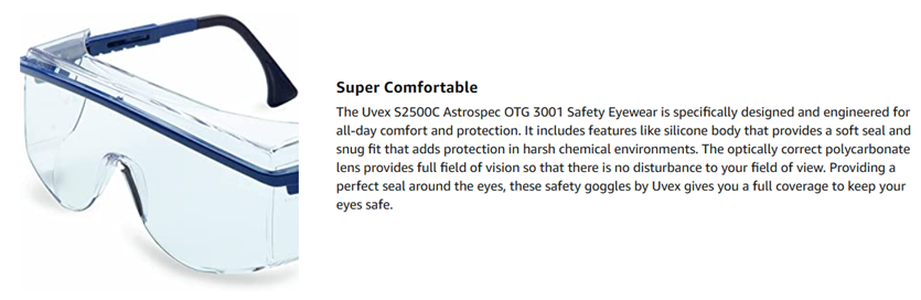 | Included Components | Uvex S2500C Astrospec OTG 3001 Safety Eyewear, Black Frame, Clear UV Extreme Anti-Fog Lens |