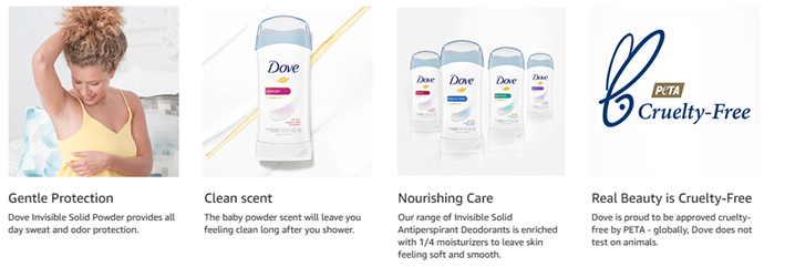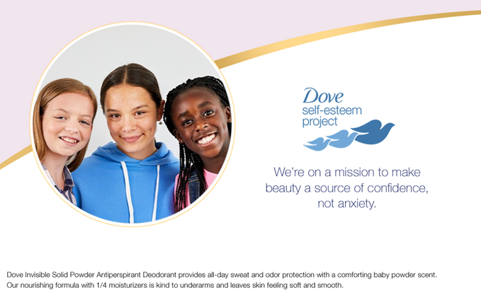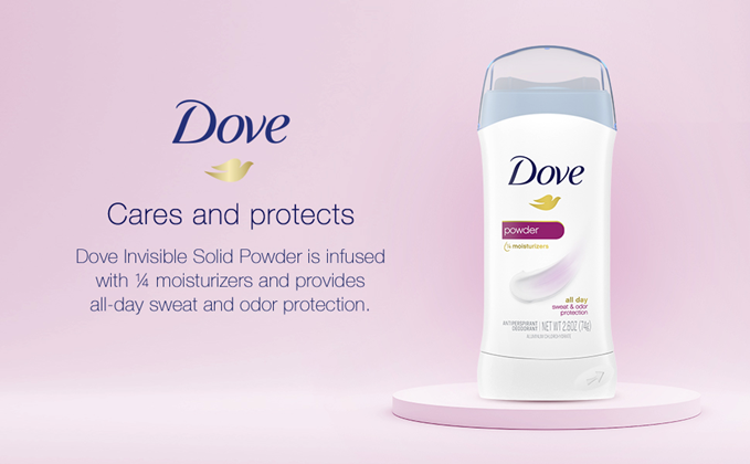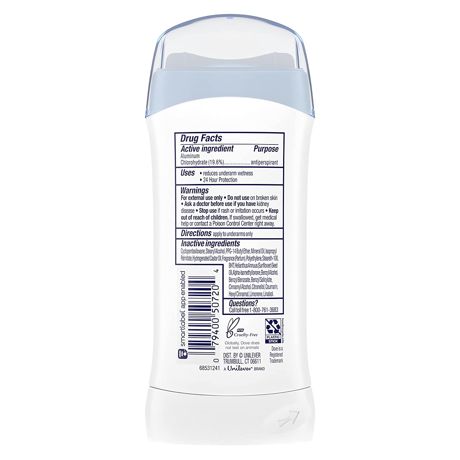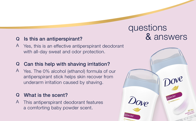 Product DescriptionFor soft, smooth underarms and invisible protection that lasts all day, look no further than Dove Invisible Solid Powder Antiperspirant Deodorant Stick. Formulated with ¼ moisturizers, this antiperspirant deodorant for women leaves your underarm skin feeling soft and smooth. The 0% alcohol (ethanol) formula helps your underarm skin recover from irritation caused by shaving, too. And it doesn't stop there. This deodorant stick gives you all day antiperspirant protection from underarm sweat and odor, has a powdery scent that indulges your senses throughout the day, and glides on for easy application. Plus, it’s invisible and leaves no white marks behind, so you can stay fresh, comfortable and confident all day long. To get the most out of your antiperspirant deodorant stick, swipe it over cool, dry underarms two or three times until an even layer is applied. Its invisible solid format means you can get dressed and go, without worrying about deodorant stains. At Dove, our vision is of a world where beauty is a source of confidence, and not anxiety. So, we are on a mission to help the next generation of women develop a positive relationship with the way they look - helping them raise their self-esteem and realize their full potential. Globally, Dove does not test on animals, so all of our antiperspirant deodorants are cruelty-free and certified by PETA for added peace of mind.