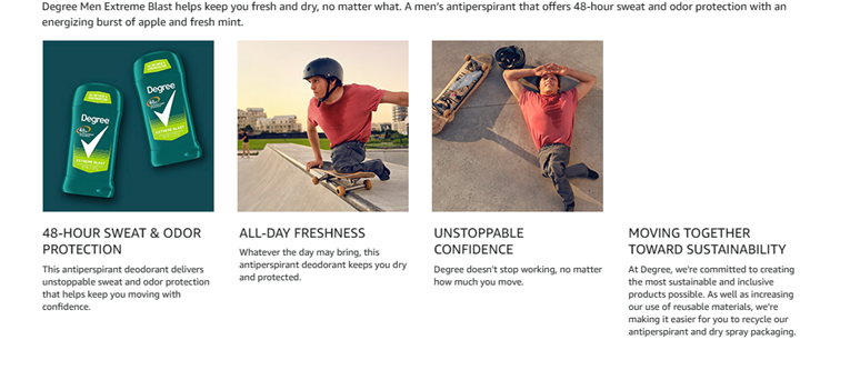 • GO BEYOND YOUR LIMITS: At Degree, we want to inspire the confidence in everyone to move more and go further. We’re here to support your journey through an antiperspirant that moves with you