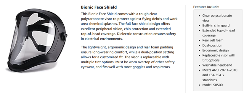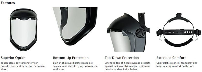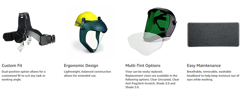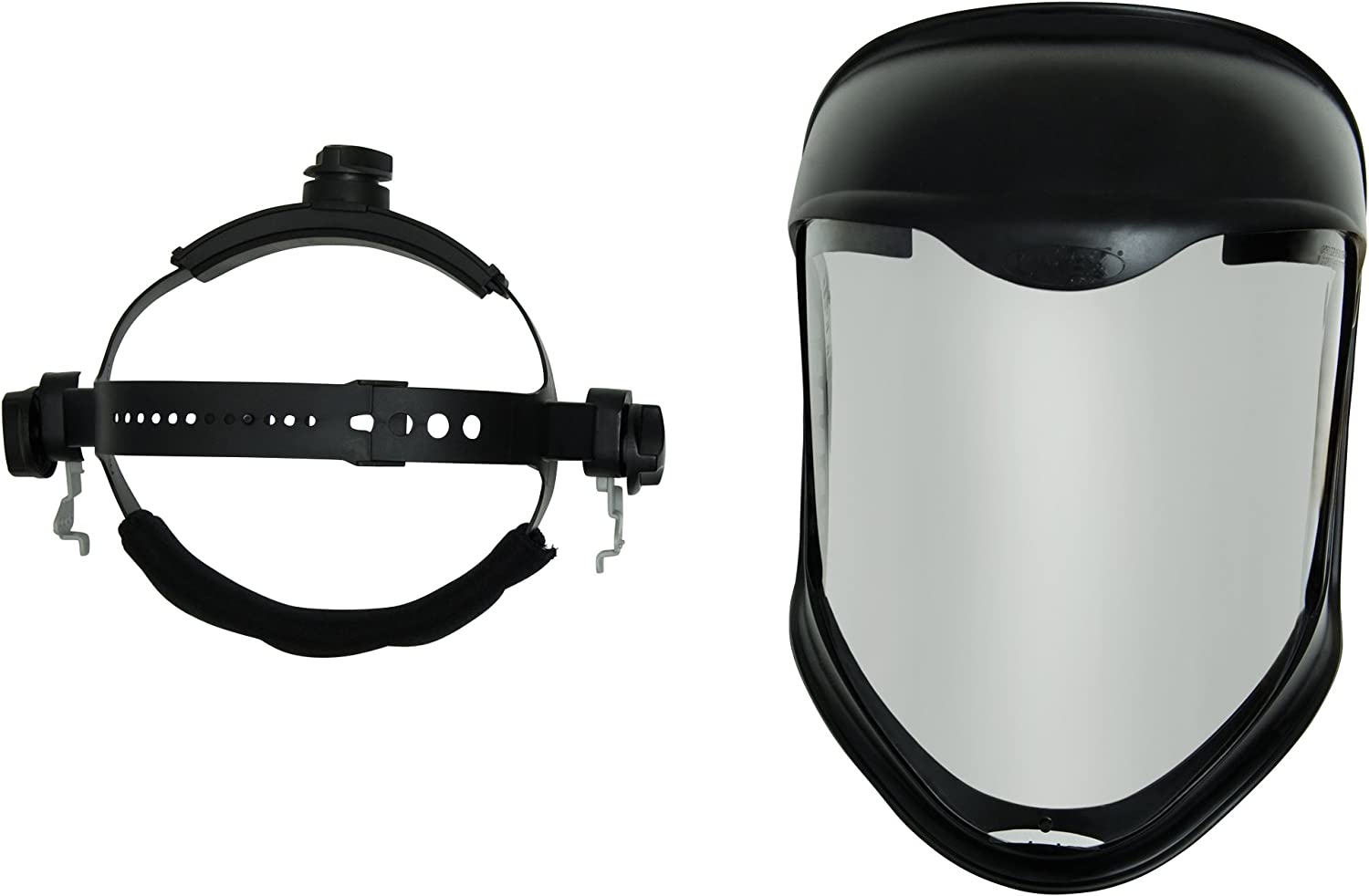 | Special Features | Excellent optics and increased visibility. . Easily replaceable visor with dual position choices . . . Secure visor attachment . . . Lightweight and balanced, ergonomic design for extended use . . . Comfortable cell foam on back of headgear . . . Breathable, removable, washable headband . . . Black matte finish . . . Comfortably worn with most goggles and respirators ., Passes ANSI Z87+ and CSA Z94.3 standards ., Faceshield offers secondary protection and must be worn with spectacles or goggles . . . |
