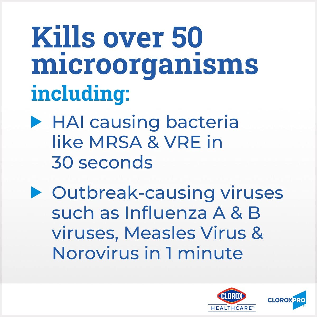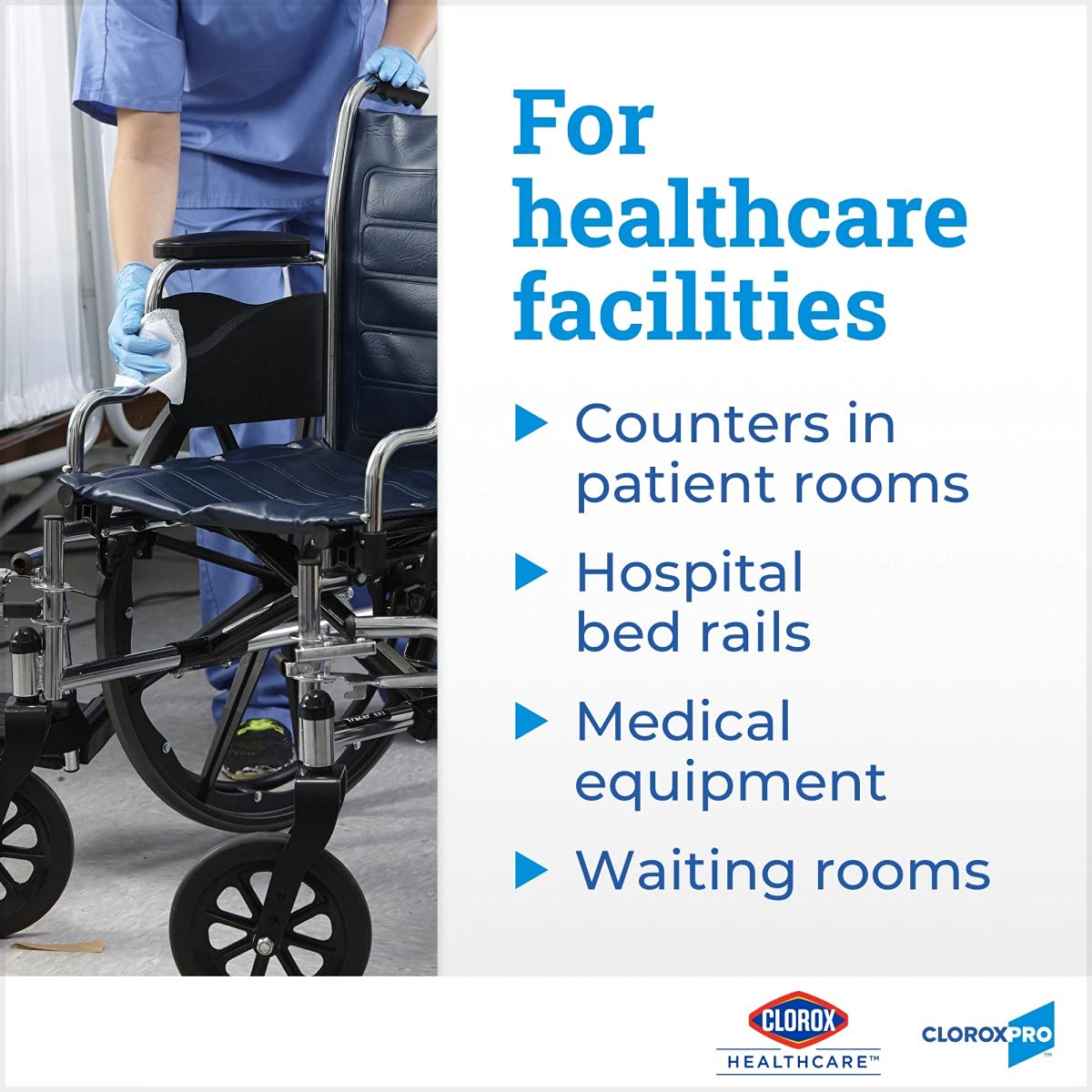 Healthcare professionals trust Clorox Healthcare Bleach Germicidal Wipes to help them overcome infection control challenges in a constantly changing healthcare environment. Clorox Healthcare Bleach Germicidal wipes are ready to use, 1 step cleaner containing a 1:10 bleach dilution to meet CDC and OSHA guidelines for disinfecting surfaces in healthcare settings. Designed for discharge disinfection, large areas. These extra-large, terminal wipes are EPA registered to kill a total of 58 microorganisms, including HAI causing bacteria like MRSA and VRE in 30 seconds, outbreak causing viruses such as Influenza A and B viruses, Measles Virus and Norovirus in 1 minute and C. difficile spores, TB and fungi in 3 minutes. These wipes kill 99.9999% of C. difficile spores, according to the current EPA recommended testing standard (June 2014). These wipes are engineered minimize residue and leave less visible residue on surfaces vs. competitor bleach wipes. These 110 count, ready-to-use wipes are 12 inch by 12 inch size. They are formulated with an anticorrosion agent and are compatible with common healthcare surfaces including stainless steel, glass, plastic, porcelain, glazed ceramic, laminated surfaces and vinyl. Intended for use in Healthcare settings.
