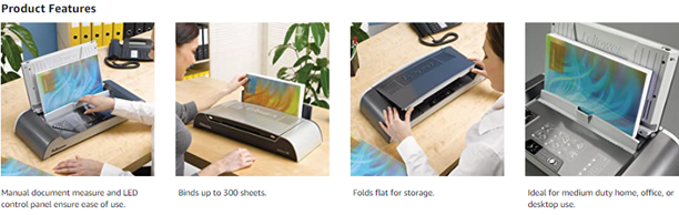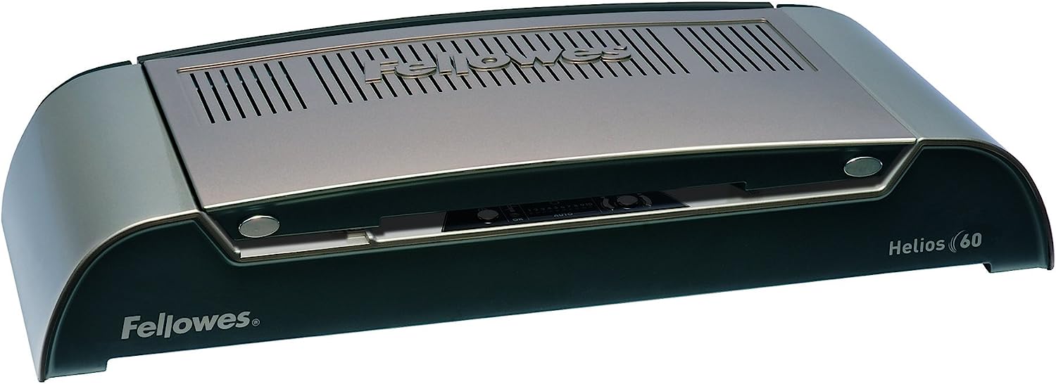 Ideal for frequent use in large offices, the Fellowes Helios 60 Thermal Binding Machine features an auto document thickness detector with auto-binding cycle that selects thermal binding settings for the user. Binds documents up to 600 sheets in a single step. 1-3 minute thermal binding cycle with 4-minute heat-up time. Heat Shield safety barrier prevents accidental contact with the heating plate. Visual indicators signal when machine is ready for thermal binding and heat cycle begins once document is loaded. Ready-beep sounds when thermal binding cycle is complete. Internal clamps hold documents in place during thermal binding process. Auto shut-off safety feature prevents overheating. Stylish design folds flat for storage. For use with thermal binding covers only.
