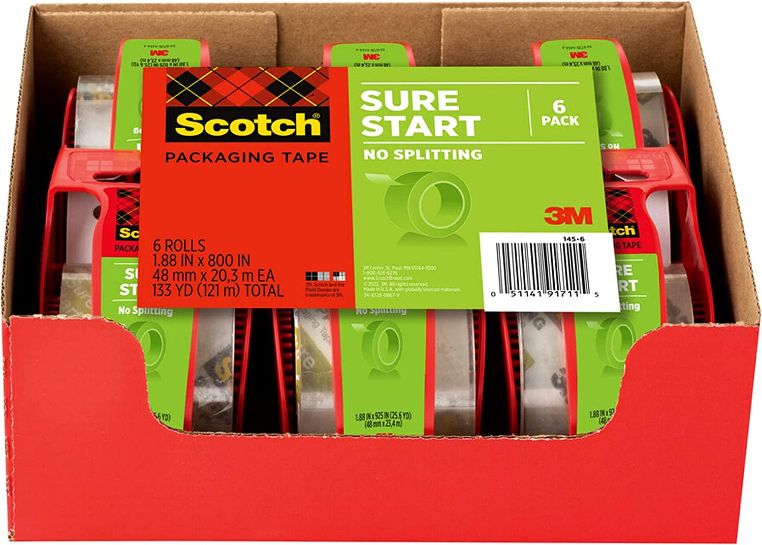 When you’re in the middle of packing boxes, the last thing you want to do is search endlessly for the end of the tape. The search is over with Scotch® Sure Start Packaging Tape. This tough, strong tape comes off the roll easily and smoothly with no slivering or splitting, so you can skip the frustration and get to taping faster. This tape also delivers a whisper quiet unwind, which makes it ideal for use in an office or home setting where quiet is critical. Never lose the tape end again, and when it quietly unwinds off the roll and is applied to your package, it stays on—keeping your package securely sealed. Clear to the core, Scotch® Sure Start Packaging Tape stands up to rough handling—but is so easy to handle. Scotch® Sure Start Shipping Packaging Tape—stress free, always ready to roll to help you get the job done.