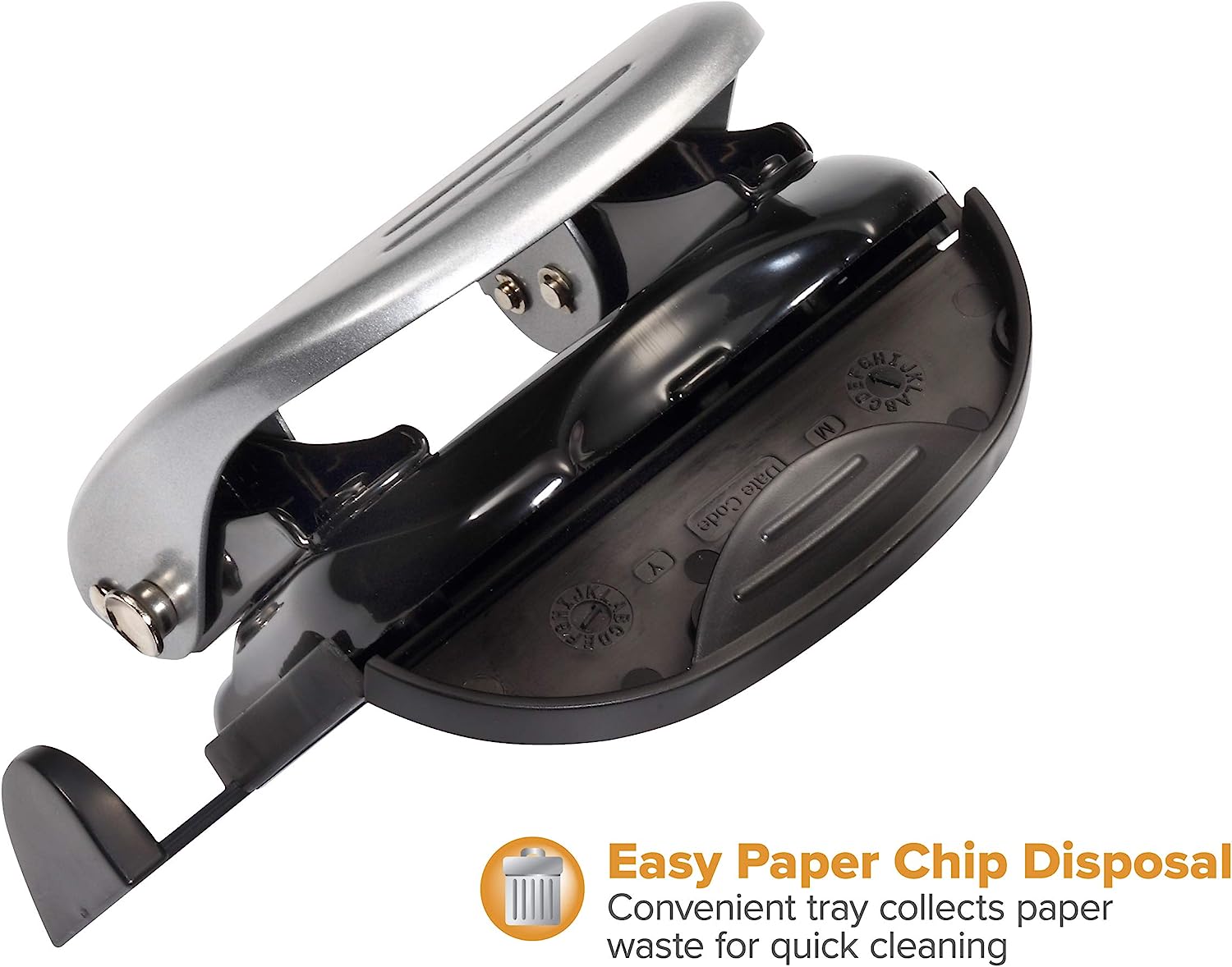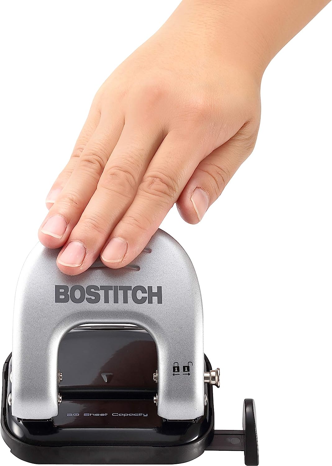 With this Bostitch two-hole punch built with PaperPro technology, easily punch up to 20 sheets, jam-free. Designed with sleek, comfortable curves and a durable all-metal design for long-lasting performance. To ensure consistent hole placement, the punch has an integrated paper guide and ruler. For maintaining a clean work environment, the base holds the chip waste and can be emptied through the flip-open door. Ideal for the home, office or school, this hole puncher is the perfect tool for any setting.