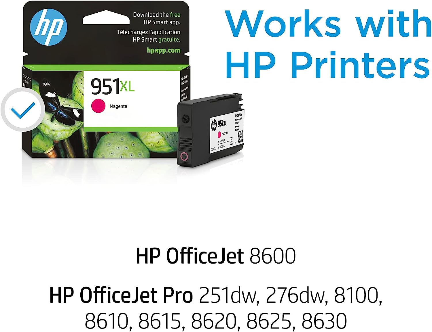 HP 951XL Magenta Ink Cartridge (CN047AN). HP 950 & 951 ink cartridges work with: HP Officejet Pro 251dw 276dw 8610 8600 8620 8100 8630 8625 8615. HP 951 XL ink cartridge yield (approx.): 1,500 pages. Get up to 2x the pages with Original HP 950XL 951XL high yield ink cartridges compared to standard 950 & 951 cartridges. Original HP ink cartridges: genuine ink for your HP printer. Ensure that your printing is right the first time and every time with HP printer ink: 951 ink. CHOOSE AN INK REPLENISHMENT SERVICE - Let your printer track usage and have ink delivered before you run out. Either reorder HP Genuine ink cartridges only when you need them through Amazon Dash Replenishment, or save up to 50% by paying for pages printed through HP Instant Ink. What's in the box: 1 New Original HP 951XL ink cartridge (CN047AN). Color: Magenta.