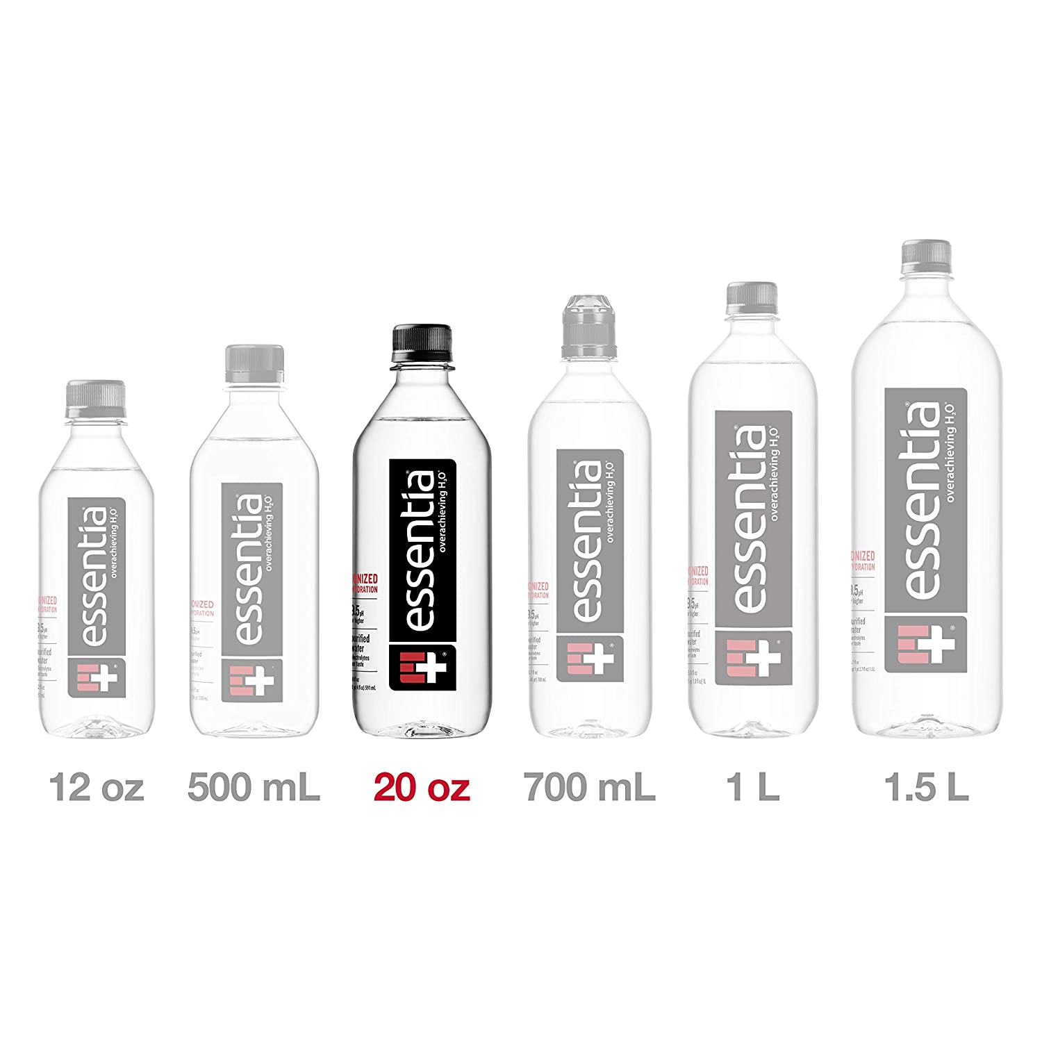 • ESSENTIA WATER CASE OF 24: Twenty-four 20 Fl Oz (591 mL) Essentia Water bottles of ionized alkaline water that’s 99.9% pure with a pH of 9.5 or higher and a clean, smooth taste — so you can stop for nothing.