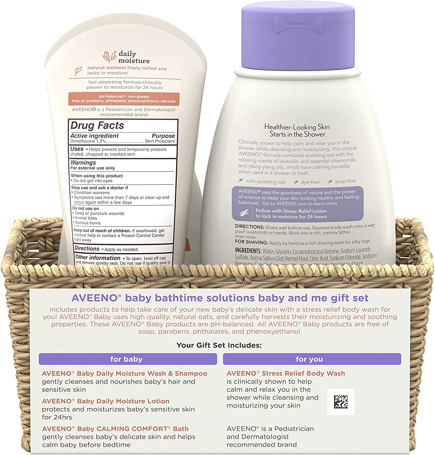 • Includes a 12 fl. oz. bottle of Aveeno Stress Relief Body Wash for mom that combines natural colloidal oatmeal with scents of lavender, chamomile and ylang-ylang oils for a relaxing soap-free cleanse that is gentle enough for everyday use