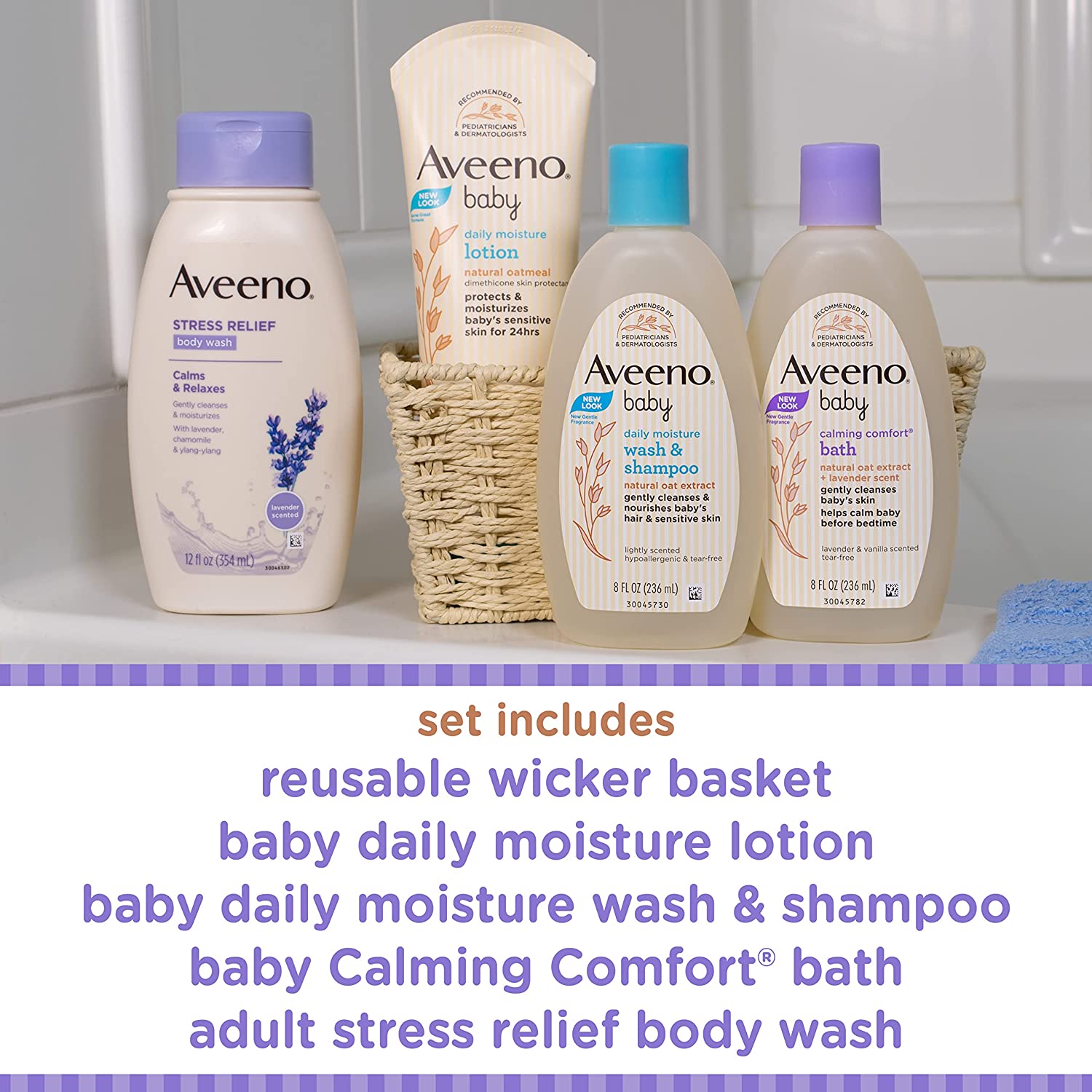 • 4-piece Aveeno Baby Mommy & Me Daily Bathtime Solutions Gift Set is a collection of baby bath essentials in a convenient, reusable wicker basket that includes everything you need for bath time with your little one, plus a bonus for mom