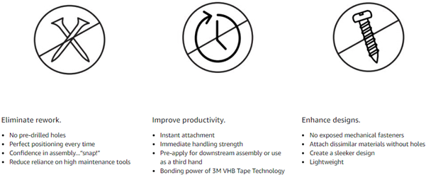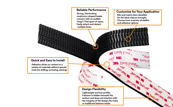 3M Dual Lock Reclosable Fasteners are used extensively in transportation, electronics, business equipment, machinery, medical, and sign and display markets They are ideal for both indoor and outdoor applications including, attaching signs, cushions, enclosure and access panels, banners, doors, adjustable shelving, vehicle ceiling panels, furniture seats and backs, and much more As a general rule, four square inches of fastener area per pound of static tensile or shear load to be supported (4in2 and lb) is suggested as a starting point for evaluation More or less area may be needed depending on specific conditions or end use applications Do not use too much of the reclosable fastener or it will be extremely challenging to separate the two parts Pry off with a screwdriver if necessary Customer is solely responsible for evaluating the product and determining whether it is appropriate and suitable for customer’s application
