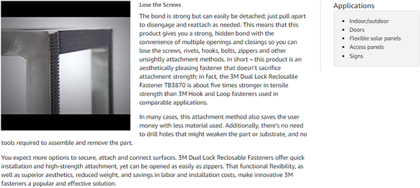 3M Dual Lock Reclosable Fasteners are used extensively in transportation, electronics, business equipment, machinery, medical, and sign and display markets They are ideal for both indoor and outdoor applications including, attaching signs, cushions, enclosure and access panels, banners, doors, adjustable shelving, vehicle ceiling panels, furniture seats and backs, and much more As a general rule, four square inches of fastener area per pound of static tensile or shear load to be supported (4in2 and lb) is suggested as a starting point for evaluation More or less area may be needed depending on specific conditions or end use applications Do not use too much of the reclosable fastener or it will be extremely challenging to separate the two parts Pry off with a screwdriver if necessary Customer is solely responsible for evaluating the product and determining whether it is appropriate and suitable for customer’s application