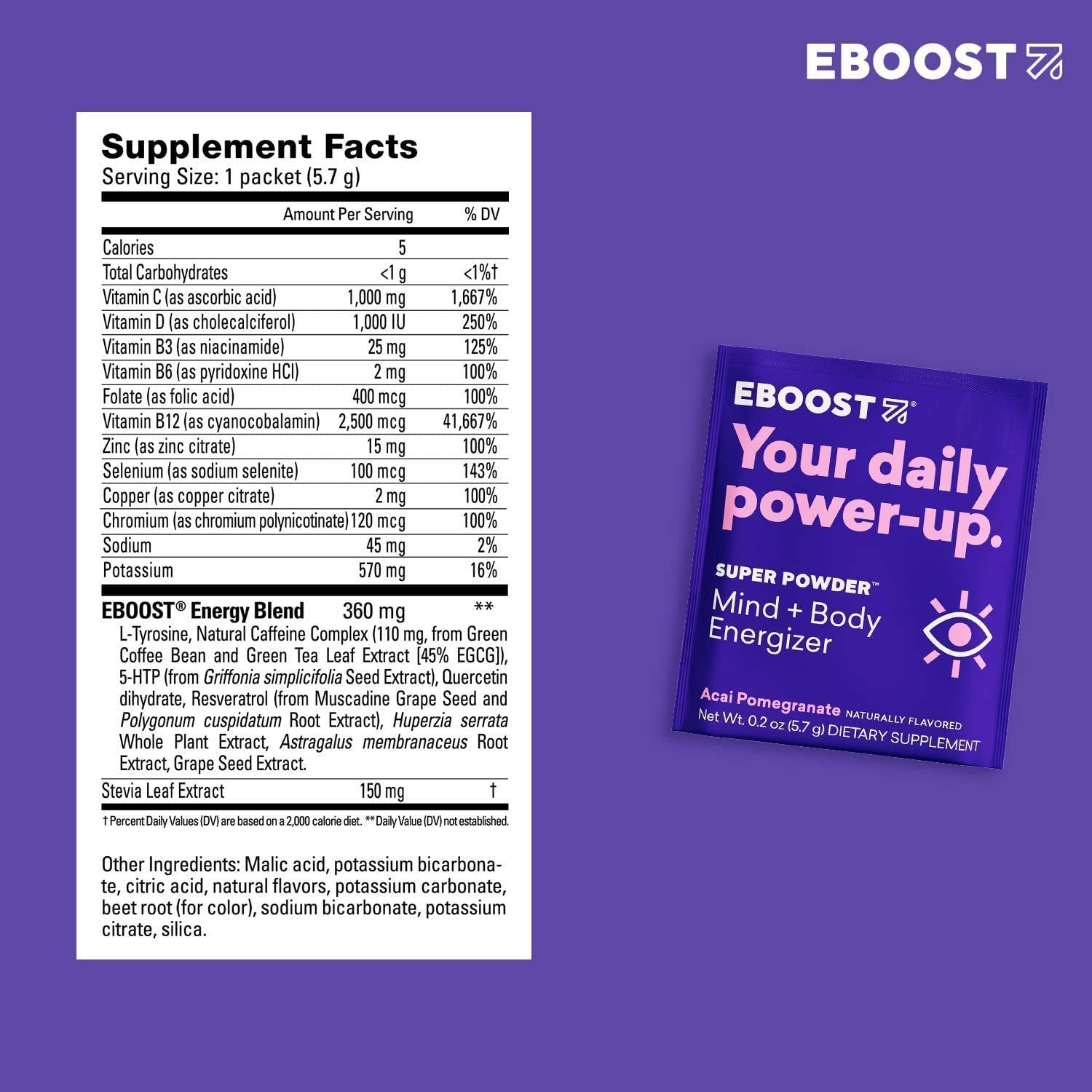 Focus And Mood Amplifier: The OG formula that started it all, EBOOST SUPER POWDER is an all-in-one little packet that holds up to its name. Experience natural daily wellness with our transformative formula that offers energy, vitamins, minerals, antioxidants, electrolytes, and mood and alertness support. Flavor: Pink Lemonade