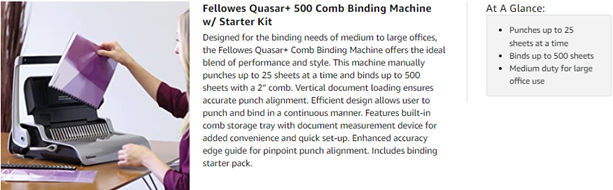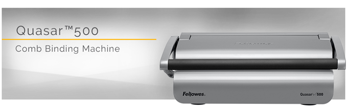 Designed for the binding needs of medium to large offices, this manual comb binding machine offers the ideal blend of performance and style. This machine manually punches up to 25 sheets at a time and binds up to 500 sheets with a 2" comb. Vertical document-loading ensures accurate punch alignment. Adjustable edge guide centers documents with ease. Efficient design allows you to punch and bind in a continuous manner. Quasar Plus Manual Comb Binding Machine also features a built-in comb storage tray with document measurement device for added convenience and quick setup. Machine also includes a binding starter pack.
