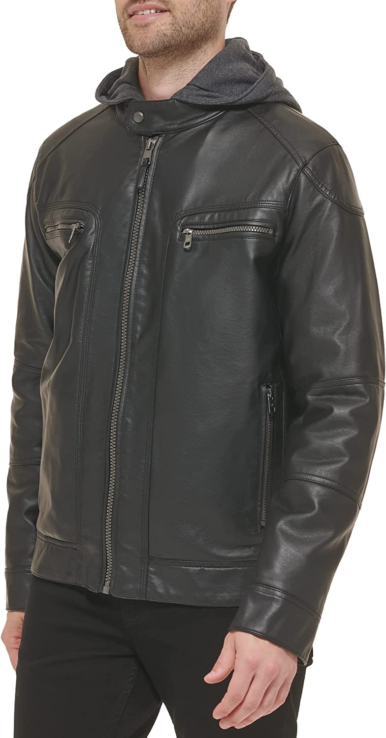 • Coat description: This faux leather jacket-men is style meets function with its removable sweatshirt, motorcycle jacket collar, snap closure, and exterior stitching
