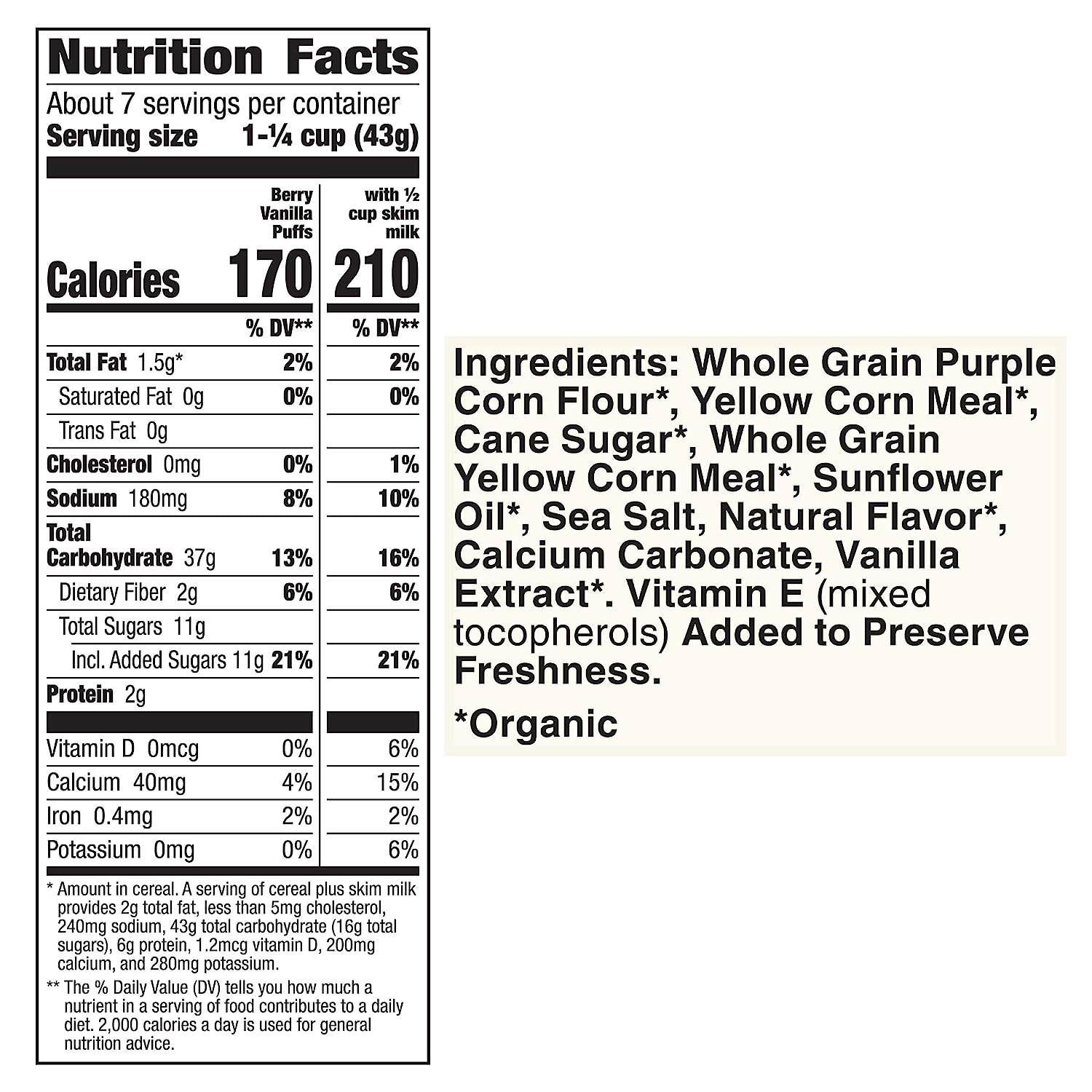 About this item VANILLA CEREAL: Made with organic whole grain puffs lightly sweetened with natural berry flavor NON GMO: Certified organic vanilla cereal made without GMOs ORGANIC SNACK: Made with high quality ingredients and contains no artificial flavors or artificial colors WHOLESOME INGREDIENTS: Made with 20 grams of whole grain (At least 48 grams recommended daily) BOX CONTAINS: 1 box, 10.5 oz