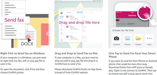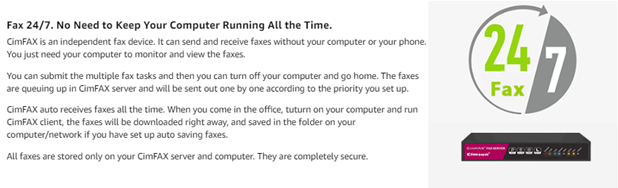 • Right Click or print with CimFAX virtual printer to send fax on Windows computer. Receives fax 24/7. Easy-to-use software.