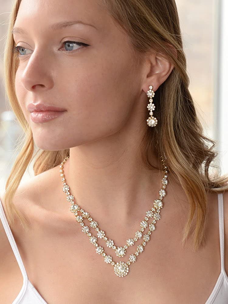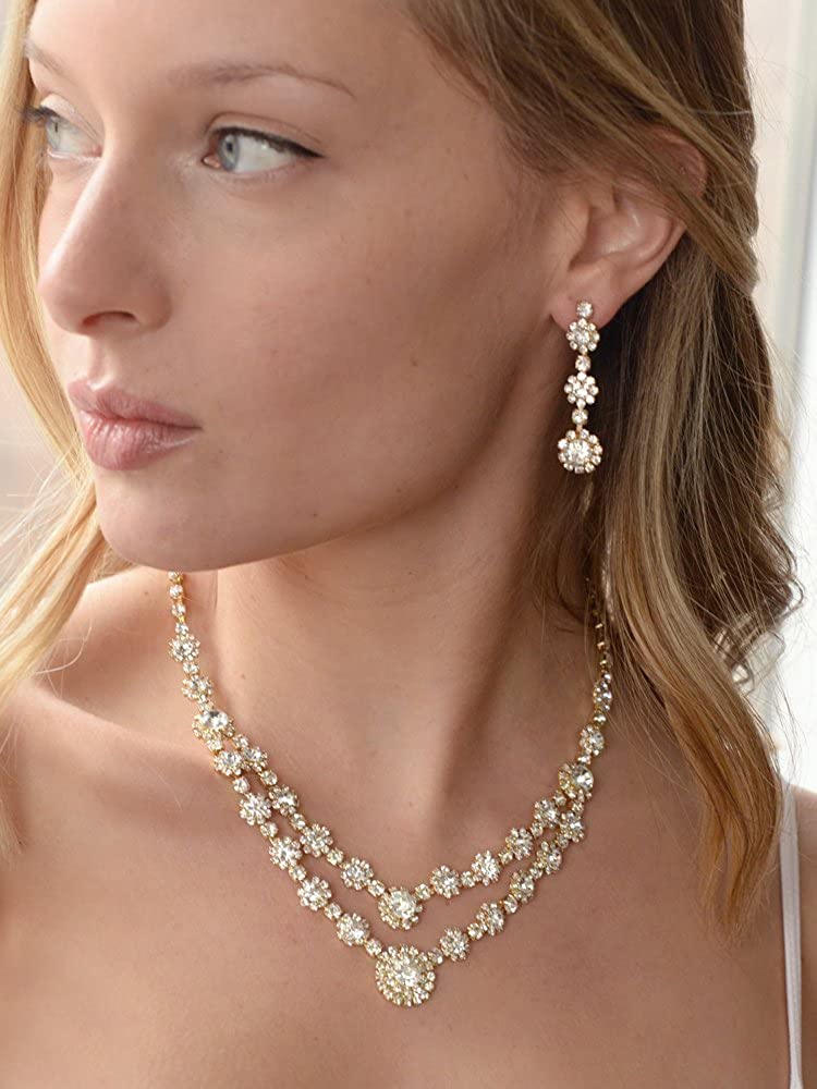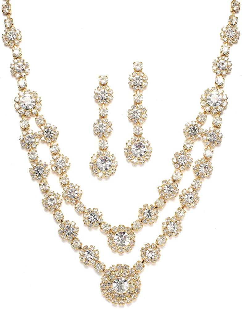 Mariell Gold Two-Row Rhinestone Crystal Necklace and Earrings Set - Prom, Brides and Bridesmaids Jewelry