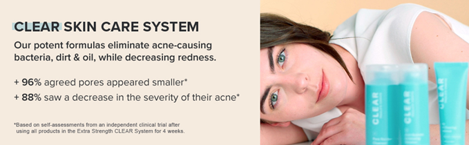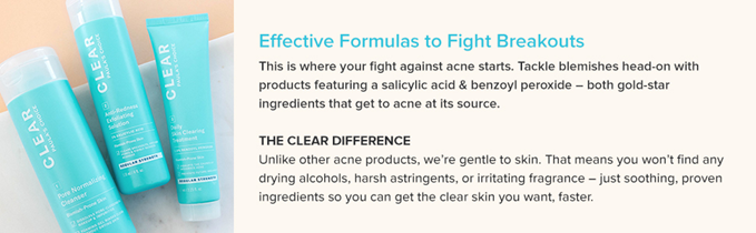 • Paula's Choice CLEAR skin care line includes our Pore Normalizing Cleanser with Salicylic Acid, Daily Skin Clearing Treatment with Benzoyl Peroxide, Anti-Redness Exfoliating Solution with 2% Salicylic Acid (BHA), Ultra-Light Daily Hydrating Fluid with SPF 30+, and the Oil-Free Moisturizer.