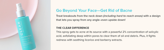 • Paula's Choice CLEAR Back & Body Acne Spray is formulated to be incredibly effective in the treatment of body acne (like back acne). 2% Salicylic acid (BHA) penetrates pores to eliminate bumps, pimples, and blackheads without the damaging effects of rough body scrubs or brushes. It is even suitable for skin prone to cystic acne.