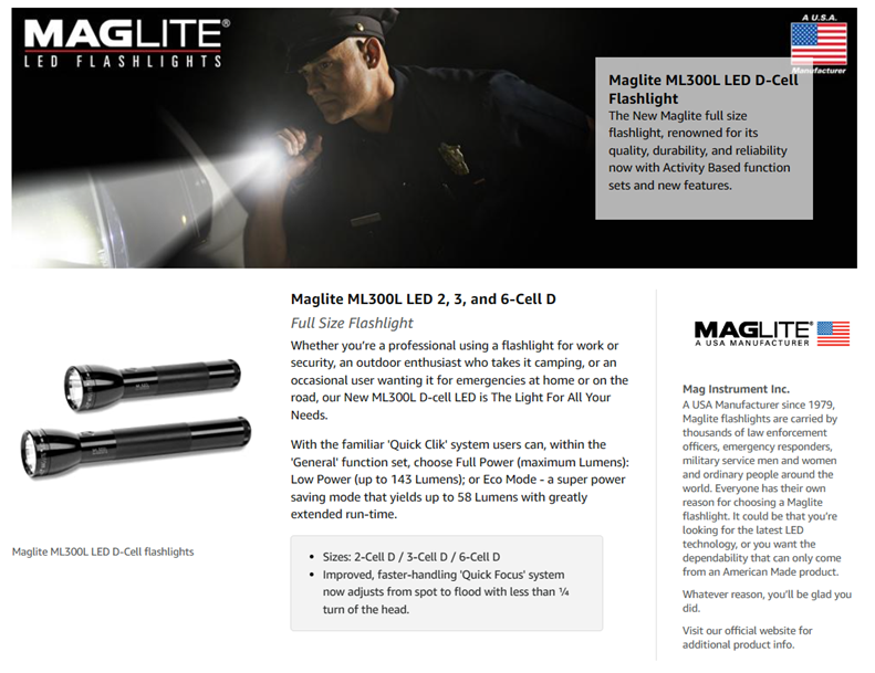 Whether you are a professional using a flashlight for work or security, an outdoor enthusiast, or an occasional user wanting it for emergencies at home or on the road; the new Maglite ML300L LED 6-Cell D Flashlight is the light for all of your needs.