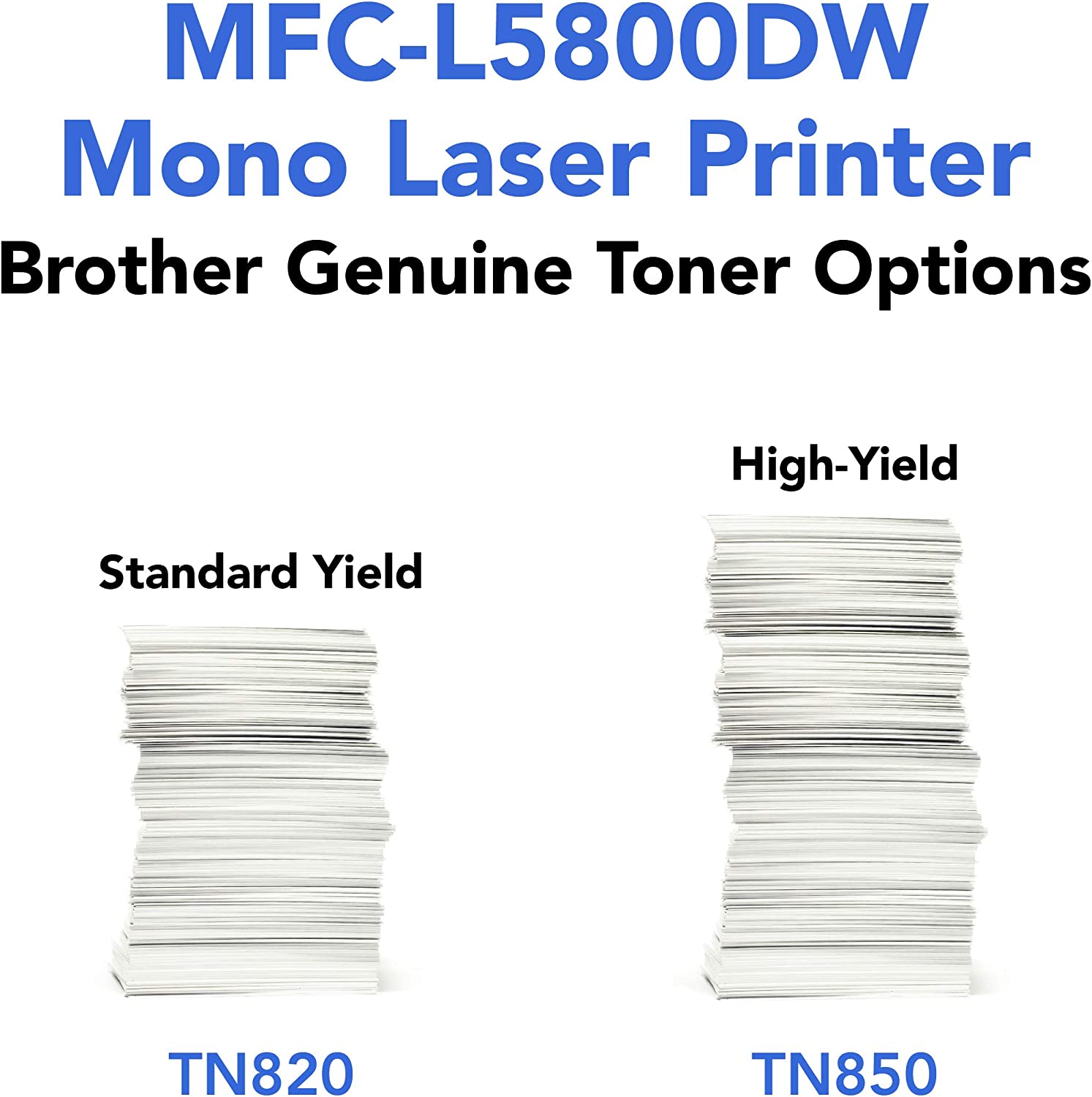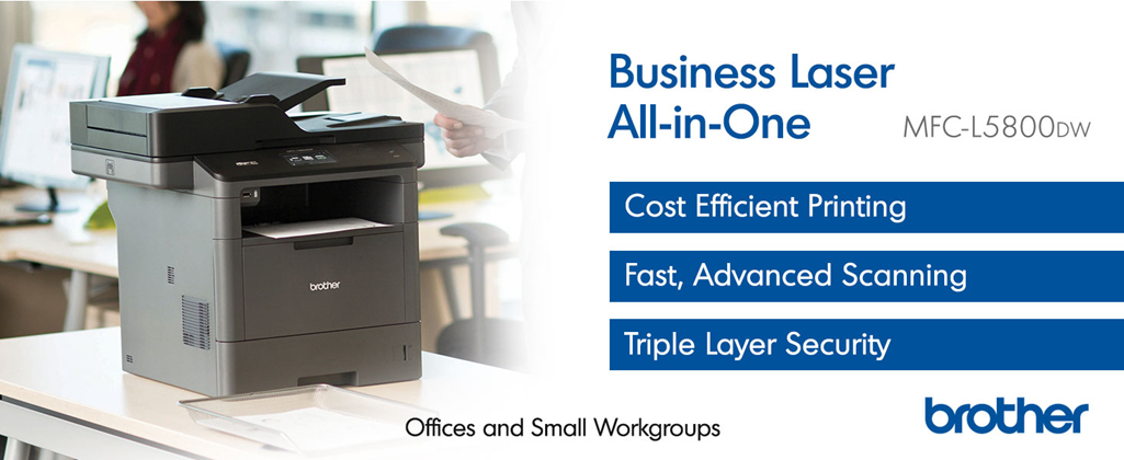 A perfect all-in-one office solution for small to medium-sized businesses, the Brother Business Laser MFC-L5800DW was engineered to help streamline office efficiency. With a print and copy speed of up to 42 pages per minute(2), this high-performance all-in-one produces professional-looking reports, spreadsheets, and other important documents with crystal-clear precision and accuracy. This Brother Business Laser All-in-One is a small office printer, copier, scanner, and fax machine that offers simultaneous operation (meaning that you can scan and print simultaneously). Also, a built-in automatic duplex printing function permits you to print on both sides of the paper, helping save money and resources. The MFCL5800DW multifunction printer offers multiple types of connectivity with Ethernet and wireless interfaces and mobile device printing and scanning support for most smartphones and tablets. (3) The easily navigated 3. 7-inch color touchscreen offers the option of creating up to 48 customized shortcuts for frequently used functions. Users can also scan to or print from popular business cloud services directly from the 3. 7-inch touchscreen display without using a computer via Evernote, Google Drive, Dropbox, and more. (1) This Brother all-in-one offers a 70-page capacity automatic document feeder for copying and scanning multi-page documents. The adjustable 250-sheet capacity paper tray and 50-sheet capacity multipurpose tray make printing and copying simple. This printer can be upgraded to a 1, 340-sheet total capacity with optional trays. The MFC-L5800DW is also Dash Replenishment enabled. This system allows the printer to measure the toner level of your Genuine Brother Replacement Cartridges and automatically order replacements. This ensures you never run out of toner so that you can maintain the office efficiency you expect and require. (1)Requires an Internet connection and an account with desired service. (2)Based on one-sided printing. Change from default setting required. (3)Requires connection to a wireless network. (4)Approximate toner cartridge yield in accordance with ISO/IEC 19752 (letter/A4).