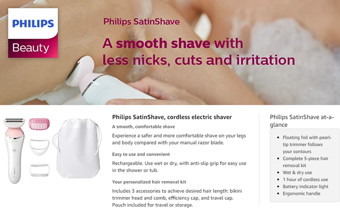 Experience a smooth shave with less nicks, cuts and irritation. SatinShave Advanced cordless electric shaver from Philips is designed to reach even curvy areas on your legs and body for less missed hairs. Hypoallergenic floating foil shaving head maintains close skin contact for an even shave. Pearl tip trimmers next to the foil protect your sensitive skin from irritation. SatinShave is effortless to use, with features that maximize your shaving convenience. Use it wet or dry, in or out of the tub, with antislip grip for easy handling. S-shaped handle allows for a better reach all over your body – and also looks good on your bathroom counter. Rechargeable lithium ion battery provides up to 1 hour of cordless usage after an 8 hour charge. Battery indicator light, so you’re not surprised by a low battery mid shave. Make sure your shaver is fully charged before using for the first time. Includes a trimming comb to attach onto the shaver head for grooming the bikini area.