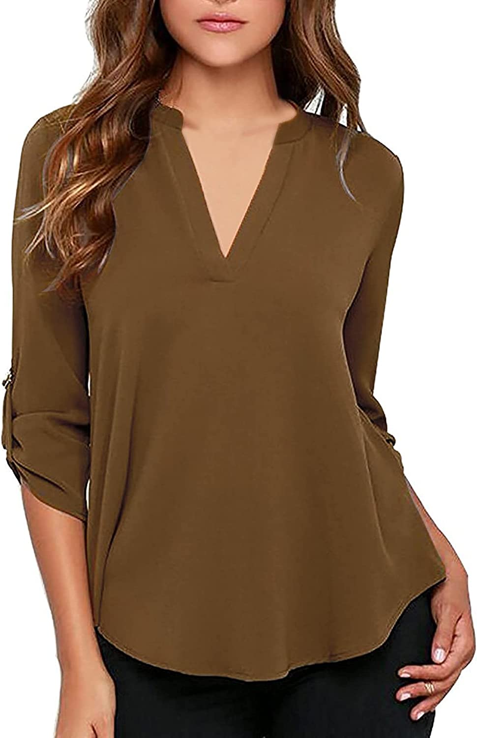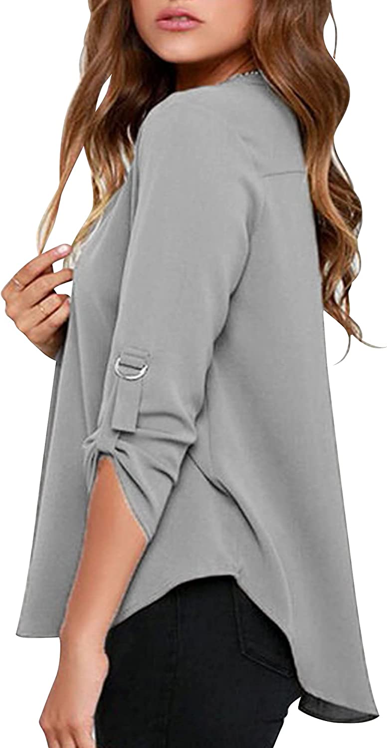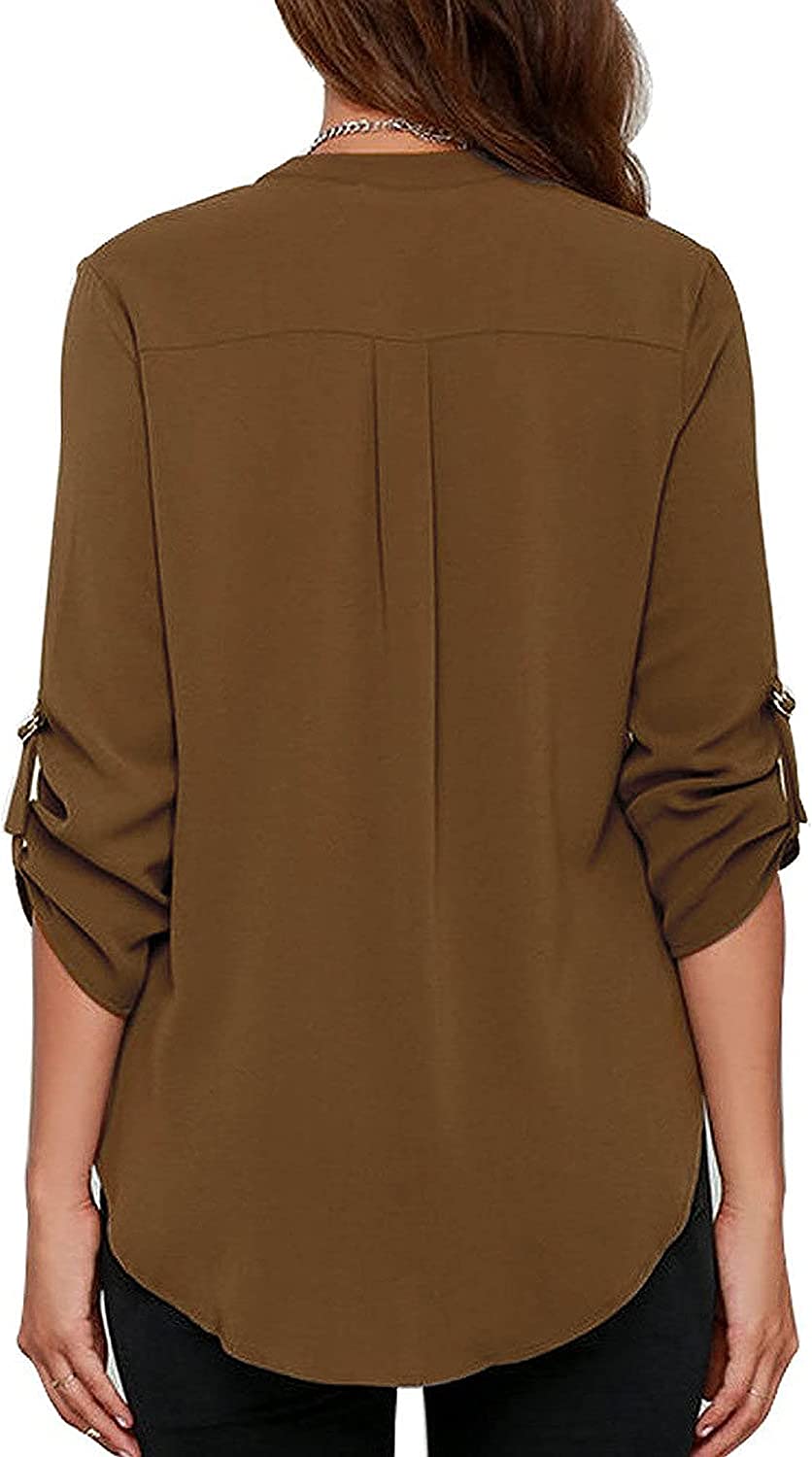 roswear Women's Business Casual V Neck Cuffed Sleeves Work Blouse Top