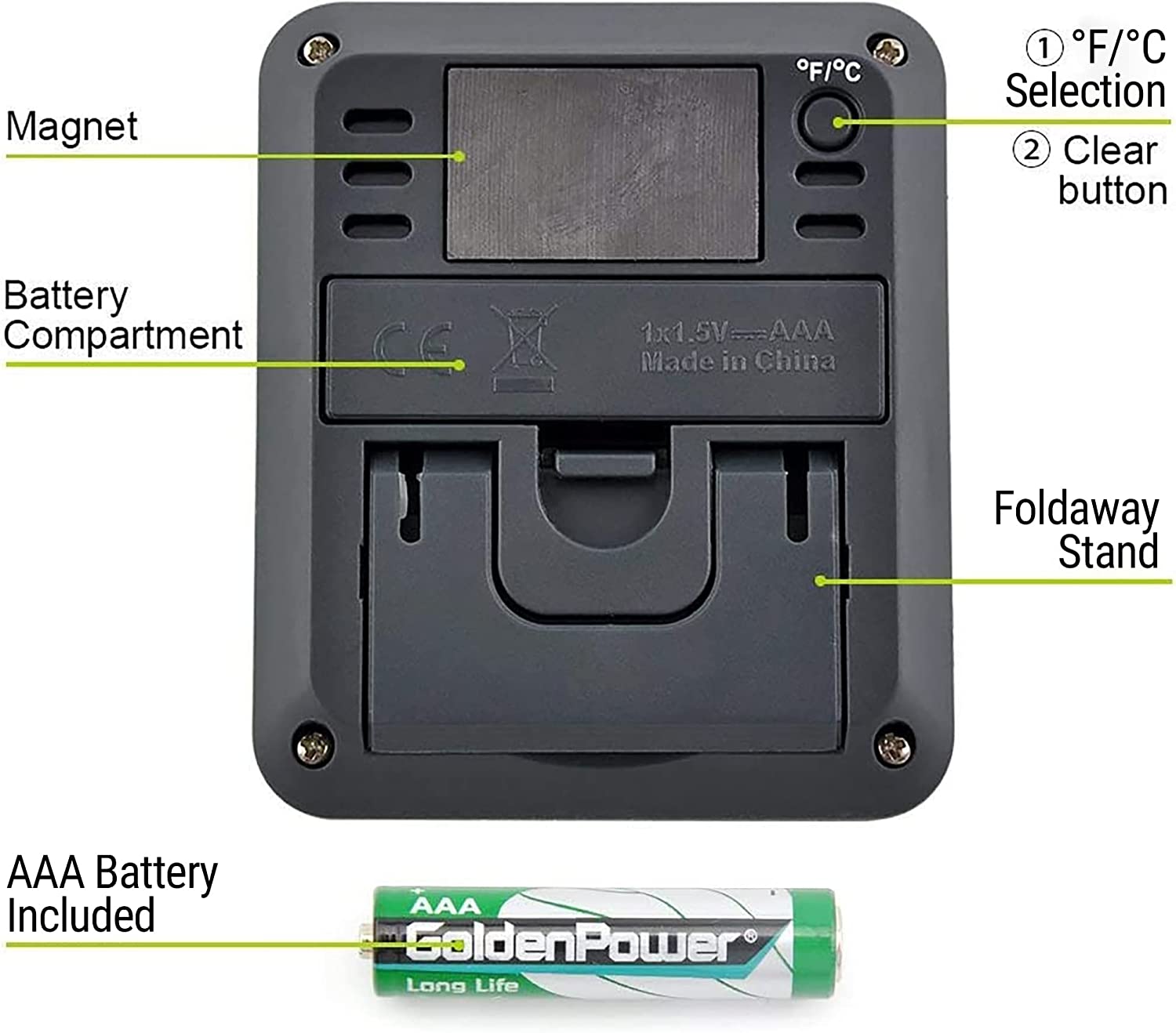 • Practical Design: This indoor room thermometer features a tabletop stand and a magnetic back, place the temperature monitor on your counter or fridge; °F/°C selector; Powered by an AAA battery (included)