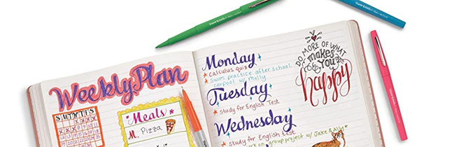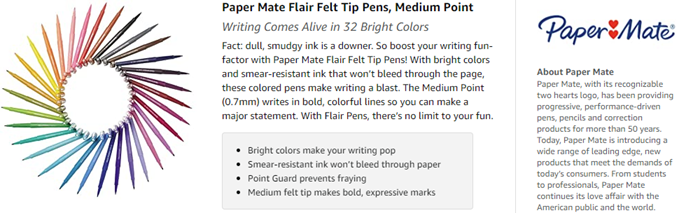The Paper Mate Flair Pens will have you loving writing. Each of the pens has Point Guard to prevent the tip from fraying, so you always produce neat lines even after repeated use. Featuring quick drying, water-based ink that resists smearing, these colored pens always leave a great impression. The ink is also specially designed so that it won't bleed through paper. The intense black ink in these medium-point pens makes it easy to express yourself with flair. Every stroke produces bold, clean lines that make them perfect drawing pens, pens for journaling, and office supplies.