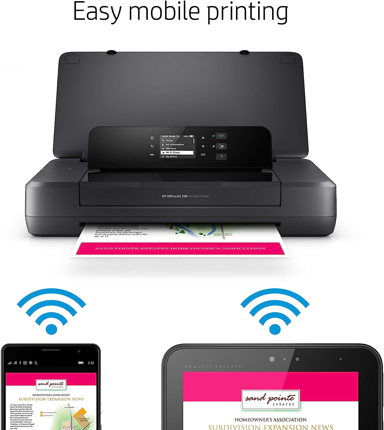 Make the world your office with powerful portable printing—no network necessary. This quick, quiet printer delivers more pages per cartridge and has a long- lasting battery life. Ideal for mobile professionals and telecommuters who need a high-quality, reliable, portable printer they can take virtually anywhere. Easy portable printing wherever you need it: Simply print from your laptop or mobile devices wirelessly, with or without a router. This durable, compact printer fits in your car, backpack, and more, for convenient printing anywhere. Start printing in minutes. HP Auto Wireless Connect makes setup easy. Lead the way with fast, easy mobile printing. Reduce charging interruptions with a long-lasting battery. Stay productive with a large and easy-to-use control panel. Set the pace for success wherever you go. Keep moving through the day with fast print speeds. Get the highest page yields of any other in-class printer, using Original HP cartridges. High-powered quality and reliability: Power through the workday. Charge from home, in your car or office, and more. Get high-quality prints time after time with a printer designed and built to be reliable. Minimize disruptions with premium design and quiet performance. Impress clients, without noisy interruptions. Plug in your AC power source to charge within 90 minutes while the printer is off, with HP Fast Charge.