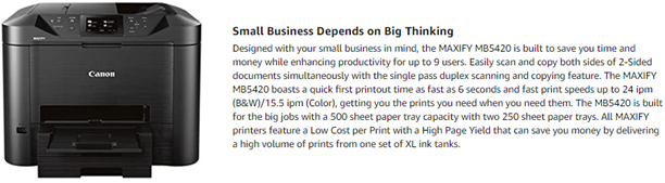 The Canon MAXIFY MB5420 Wireless Small Office All-In-One Printer is designed to meet the needs of smaller businesses with up to nine users, by delivering high-quality, low-cost prints. It boasts a quick first printout time as fast as 6 seconds with fast print speeds up to 24 ipm (B&W)/15. 5 ipm (Color) getting your prints you need when you need them. Power through paperwork with single-pass duplex scanning which simultaneously scans both sides of two-sided documents, enabling fast multi-page copying and scanning. The MB5420 is built for big jobs with a 500 sheet paper tray capacity, and a high page yield of 2500 B&W/1500 color prints when using XL ink tanks. Always stay connected and informed with built-in standard Management Information Base (MIB) support, which allows you to easily manage the MAXIFY printers on your network. Built-in Wi-Fi networking makes it easy to connect and print from your computer and favorite mobile devices, and with the Canon PRINT app, you have the added features of being able to print from the cloud and scan directly to your mobile device. Best of all, the MB5420 printer is backed by 100% U. S. -based customer service & support.