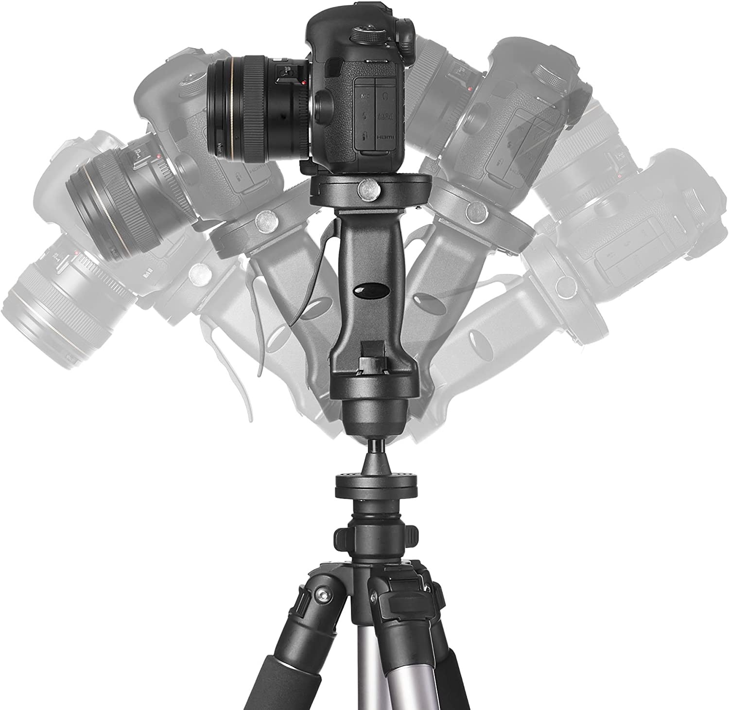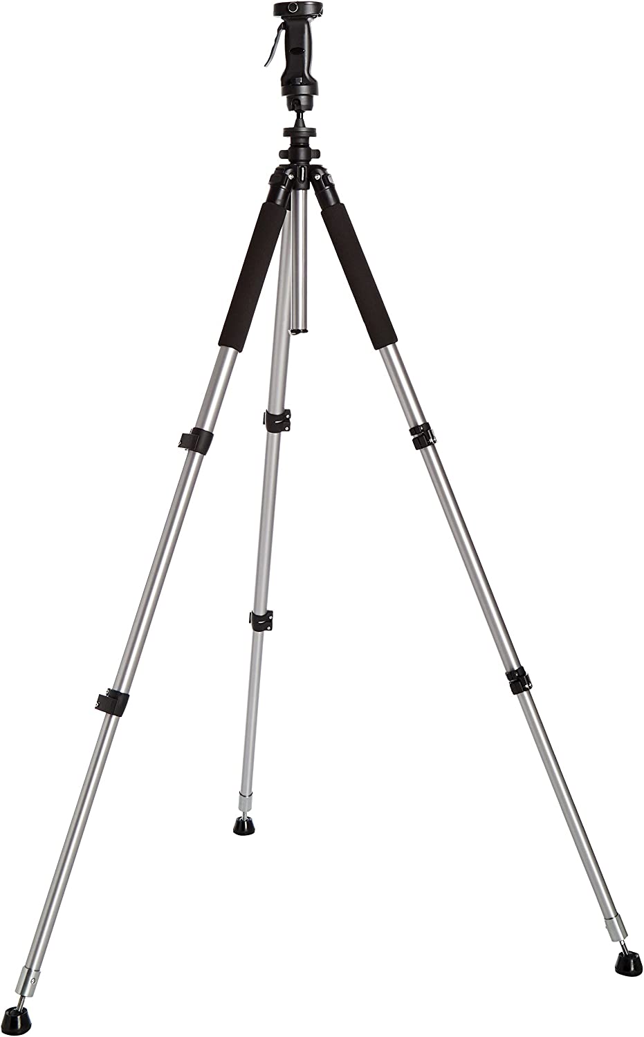 Pistol grip tripod with adjustable-height aluminum legs and rubber feet with retractable metal spikes for outdoor use