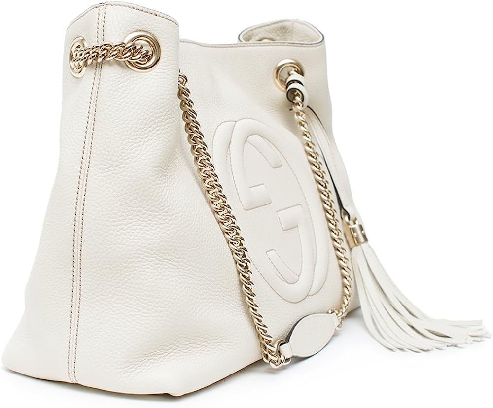 The Gucci Soho Chain Hobo Bag is a medium size shoulder bag with double chain shoulder straps. Featuring a roomy interior with pockets, detachable tassel detail, light gold hardware, and an embossed interlocking GG on front.