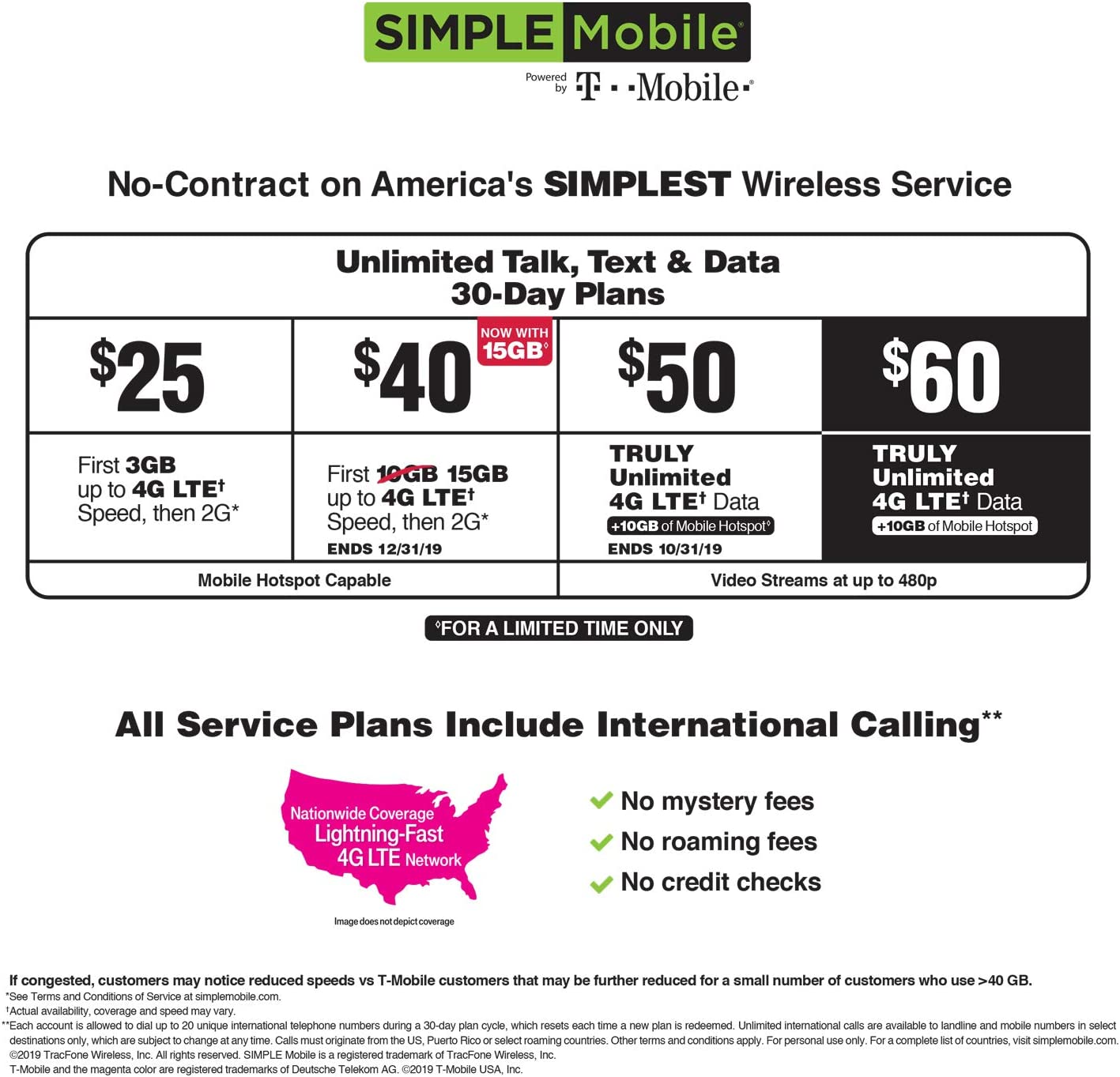 PLANS - Simple Mobile offers a variety of coverage plans, including 30-Day Unlimited Talk, Text & Data. No activation fees, no credit checks, and no hassles on a nationwide lightning-fast network. For more information or plan options, please visit the Simple Mobile website.