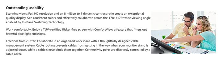 Dell 24 Touch Monitor. Viewable image size (diagonal) 60.47 cm (23.8 inches). Active display area Horizontal - 527.04 mm (20.75 inches), Vertical - 296.46 mm (11.67 inches). Maximum resolution 1920 x 1080 at 60 Hz. Aspect ratio 16:9. Pixel pitch 0.275 mm x 0.275 mm. Brightness (typical) 250 cd/m . Color gamut (typical) 84% (CIE 1976). Color depth 16.7 million colors. Contrast ratio (typical) 1,000:1, Dynamic contrast ratio 8 million:1. Viewing angle (typical) (vertical/horizontal) 178 /178 . Response time (typical) 6 ms gray-to-gray. Panel technology In-plane switching, anti-glare with 3H hardness. Backlight LED. Speaker (optional) Recommended desktop speaker ? Dell 2.0 Speaker System (AE215). Connectors 1 x DisplayPort (ver 1.2)6, 1 x HDMI (ver 1.4), 1 x VGA, 1 x USB 3.0 port upstream, 2 x USB 3.0 ports (side) (including 1 x USB 3.0 BC1.2 charging port), 2 x USB 2.0 ports (bottom), 1 x Analog 2.0 audio line out (3.5 mm jack). Touch features Type: projected capacitive system; Input: bare finger; Points: 10 touch points; Response time: 35 ms; Resolution: 4096 x 4096; Operating systems supported: Windows 10, 8.1, 7. Articulating stand Height adjustable (90 mm), Tilt (-5 to 60 ), Swivel (-30 to 30 ). VESA mounting support (wall mount kit sold separately) 100 mm x 100 mm. Security lock slot (security lock not included); Anti-theft stand lock slot (to panel) AC input voltage/frequency/current 100 to 240 VAC/50 or 60 Hz 3 Hz/1.5 A (typical). Power consumption (typical) 18W. Power consumption (ENERGY STAR) 16W. Power consumption standby/sleep mode <0.3 W