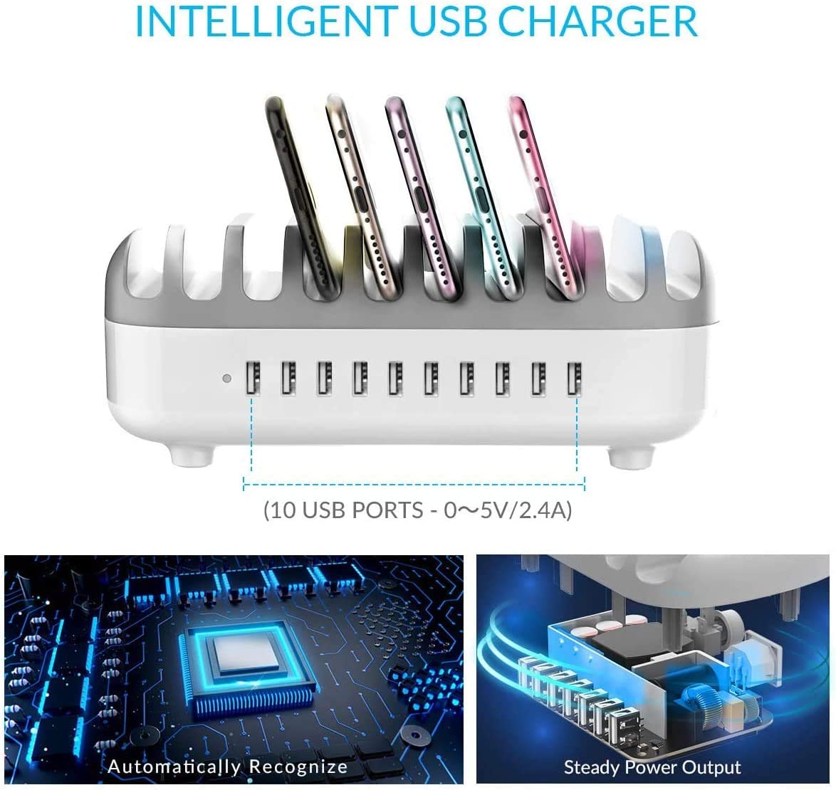 • 【SAFE & INTELLIGENT USB CHARGER】Built-in surge protection against overcharging, surges and overheating, short circuit protection, overload protection, And Even when 10 devices charged simultaneously, Built-In smart chip automatically recognize, adjusting and distributing the optimal output, each device can get the max charging speed.
