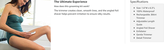 Grooming should be easy. And it is with the Remington Smooth & Silky 5-Piece Body and Bikini Groomer Kit. It includes all the attachments you need to look and feel your best. The bikini trimmer and adjustable length guide are perfect for quick touch-ups and shaping the bikini line. The angled foil shaver gets you extra close, with a hypoallergenic foil to prevent skin irritation. Keep skin fresh with the rotating exfoliator attachment. The dual-sided gentle trimmer easily cuts away unwanted hair in delicate areas, and the precision-edge detail trimmer is perfect for tight spots. Plus, the waterproof design means you can use it in the shower or out to find what's most comfortable for your skin. 16 Hour Recharge Time.
