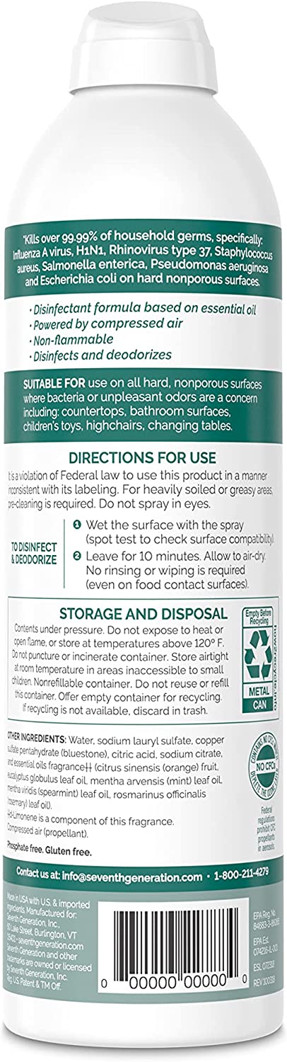 Just because you can’t see household germs, doesn’t mean they aren’t there. Seventh Generation Disinfectant Spray kills 99.99% of household germs, botanically. This includes cold and flu viruses*. The disinfecting spray formula does not require a rinse, even on food contact surfaces, and contains no synthetic fragrances or chlorine. Our Eucalyptus, Spearmint & Thyme Scent Disinfectant Spray is scented with essential oils and botanical extracts and leaves a spearmint and herbal scent. EPA registered disinfectant and deodorizer can be used around kids and pets and is suitable for use on all hard non-porous surfaces including children’s toys, pacifiers, gym equipment, food contact surfaces, and more. Try all the Seventh Generation Household Products; All Purpose Cleaner, Stone Cleaner, Wood Cleaner, Glass Cleaner, Granite Cleaner, toilet bowl cleaner, and disinfectant cleaner products. At Seventh Generation, we do business differently. We believe our products are healthy solutions for use within your home–and for the community and environment outside it. Not only that, but we believe it is our responsibility to set a course for a more mindful way of doing business, where companies act as partners with other stakeholders to create a brighter future for the whole planet. Seventh Generation is proud to be a Certified B Corporation. B Corps are certified to be better for workers, better for communities, and better for the environment. By choosing Seventh Generation products, you’re joining us in nurturing the health of the next seven generations. A partnership with the CleanWell Company, makers of the patented thyme-based disinfecting technology, brings you a line of Seventh Generation Disinfecting Sprays with CleanWell Inside. *Kills over 99.99% of household germs, specifically: Influenza A virus, H1N1, Rhinovirus type 37, Staphylococcus aureus, Salmonella enterica, Pseudomonas aeruginosa and Escherichia coli.