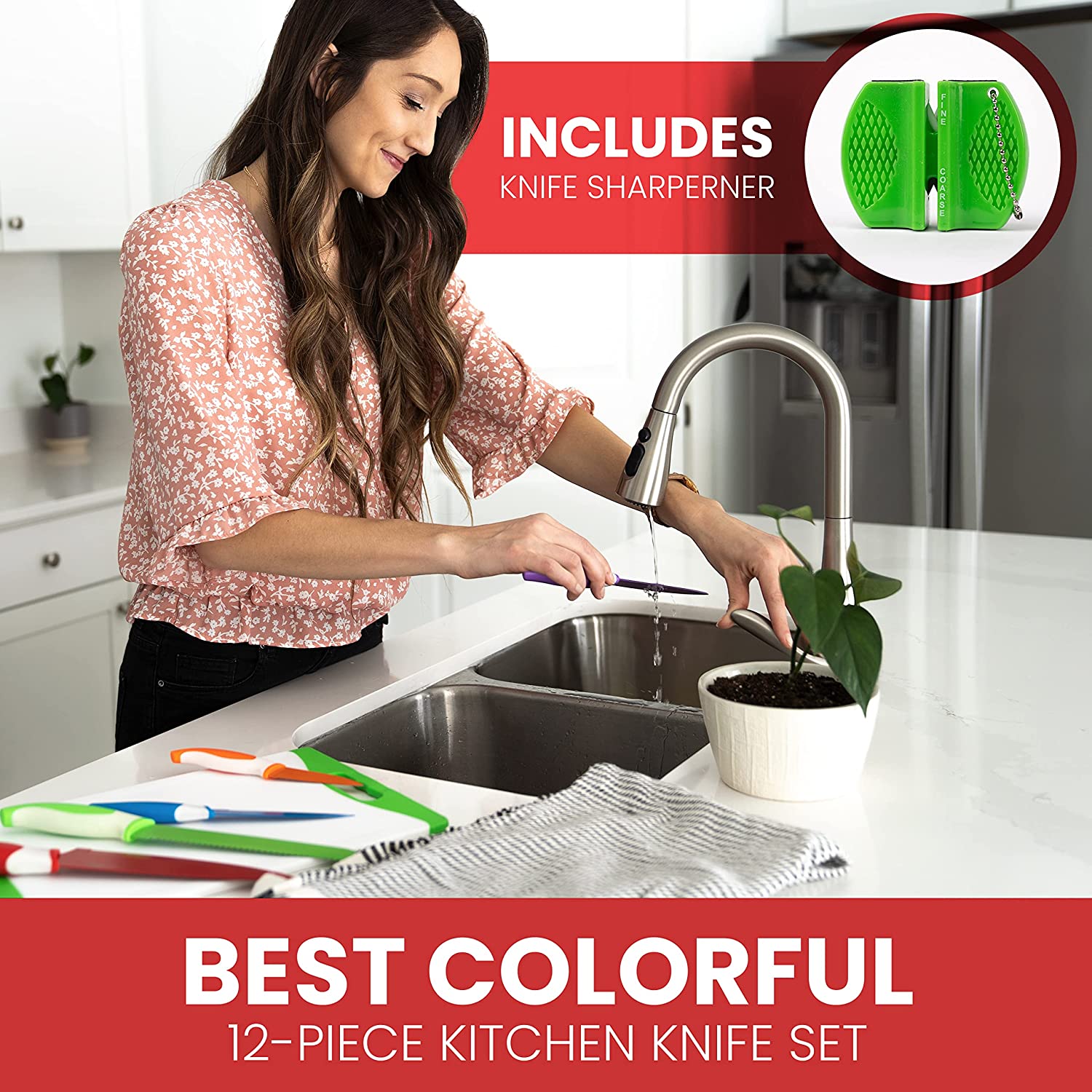 EATNEAT 12-Piece Colorful Kitchen Knife Set - 5 Colored Stainless Steel Knives with Sheaths, Cutting Board, and a Sharpener - Razor Sharp Cutting Tools that are Kitchen Essentials for New Home