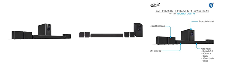Complete your home theater experience with stunning sound from this 5. 1 channel powered speaker system. You'll hear every detail whether you connect via Bluetooth or RCA input. This home theater system features 6 surround speakers: subwoofer, front left and right, surround left and right and a 26 inch sound bar. With a wireless range of 60 feet, this system includes a remote control, 3. 5mm to RCA audio cable, 3 RCA stereo audio cables, and user's guide. Sound bar and satellite speakers are wall mountable (hardware not included). iLive products offer exciting, innovative features with a quality and affordability that you can depend on. AC power: built-in AC power cable,Soundbar Dimensions: 26 x 2.5 x 2.5,Single Speaker Dimensions: 3.54 x 2.95 x 3.54,Subwoofer Dimensions: 5.43 x 8.86 x 9.65,Cloth speaker grill,LED function indicator.