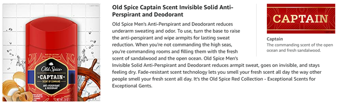 Old Spice Men's Anti-Perspirant and Deodorant reduces underarm sweating and odor. To use, turn the base to raise the anti-perspirant and wipe armpits for lasting sweat reduction. When you're not commanding the high seas, you're commanding rooms and filling them with the fresh scent of sandalwood and the open ocean. Old Spice Men's Invisible Solid Anti-Perspirant and Deodorant reduces armpit sweat, goes on invisible, and stays feeling dry. Fade-resistant scent technology lets you smell your fresh scent all day the way other people smell your fresh scent all day. It's the Old Spice Red Collection-Exceptional Scents for Exceptional Gents.