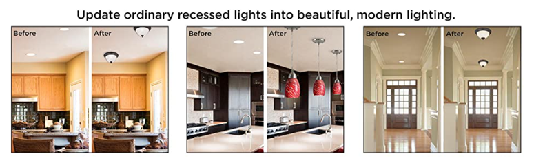 This unique patent-pending Westinghouse Recessed Light Converter offers an easy way to transform your existing recessed lighting into a pendant or light fixture with no major remodeling. Let your creativity inspire you to update your home lighting with this quick and easy upgrade. Hang any pendant or other light fixture of 50 pounds or less where recessed lighting is currently used in your home.The Recessed Light Converter adjusts to any can size between 4-inch and 6-inch, there are no visible screws or hardware and the decorative medallion can be painted to match any decor. This converter works with existing recessed cans that use medium base PAR16, R16, A19, R20, PAR20, BR25, BR30, R30, PAR30, BR38, PAR38, BR40 or R40 light bulbs and is suitable for damp locations.Perfect for kitchens, family rooms or anywhere recessed lighting is used. It includes a versatile white decorative medallion, adjustable bar, socket adapter and mounting hardware for convenient installation.This Westinghouse Recessed Light Converter is CETL listed for safety.Product reference number 01011.