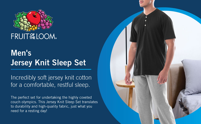 You unwrap the package; you just know it's another pair of pajamas, so maybe your heart drops a little. As you rip off the wrapping, you are pleased to discover that familiar Fruit with a bright red apple staring back at you: Fruit of the Loom. Despite initial reservations, you grin; you know good quality when you see it. And then you pull out the jersey knit sleep set which you are pleased to discover is a soft-hand feel. This means it melts a little under your fingers. It's really that soft. You know you'll be sporting this little number out on the backyard grill, in the confines of your bedroom, in your man Cave. The three button henley collar top adds a bit of style. You're thinking you may even walk through the front door and grab the mail with this set. Jersey knit translates to durability. Fruit of the Loom translates to high-quality fabric, in this case, 100 percent cotton, perfect for undertaking the highly coveted couch olympics. It's a generous, relaxed fit, too, with an elasticized self-draw cord waist on the pants (you control your own fit). you certainly won't have to worry about fabric marks on your skin post-wear. With two side pockets for remote-control, cell phone or whatever-you-deem-necessary storage, you can already envision long nights wearing your new Fruit of the Loom men's jersey-knit sleep set. You pour yourself another cup of Joe. It's going to be a good day.