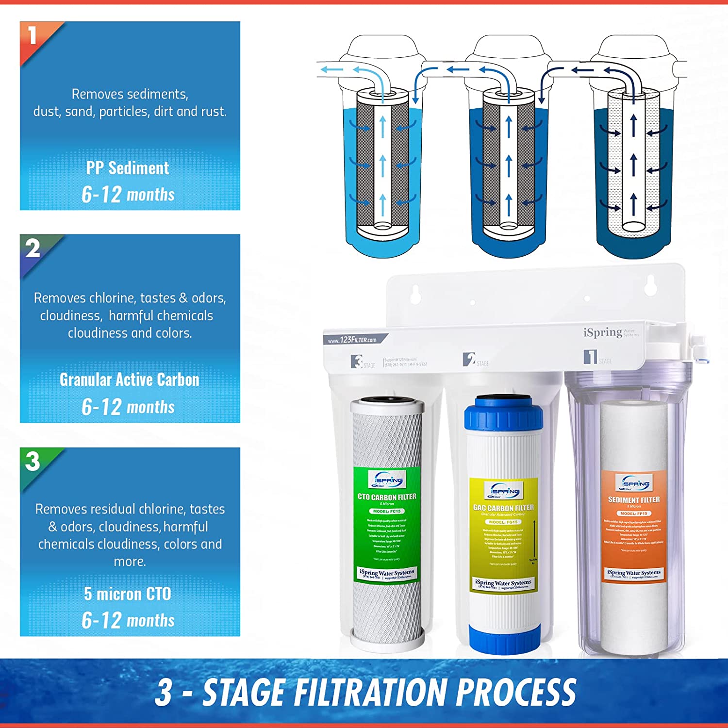 - [Easy to Install and Maintain]: This system is designed for easy installation, low maintenance, and features dual carbon block filters along with a high-capacity sediment filter. The sediment filter protects and extends the life of your system, while the carbon block filters work to remove many harmful contaminants a. You can replace the filter every 6 to 12 months, judged by the water’s taste.