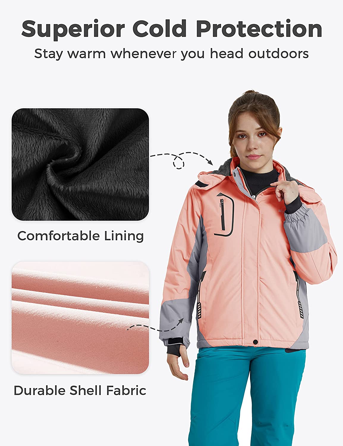 Keep The Cold & Snow Out - This fleece-lined snowboarding for girls is the ideal choice for keeping your kids warm and protected from harsh winds and snow. The hooded fleece ski jacket for girls features adjustable cuffs with thumbhole, detachable fleeced hood and wide collar, all designed to keep cold air and snow out and warmth in.