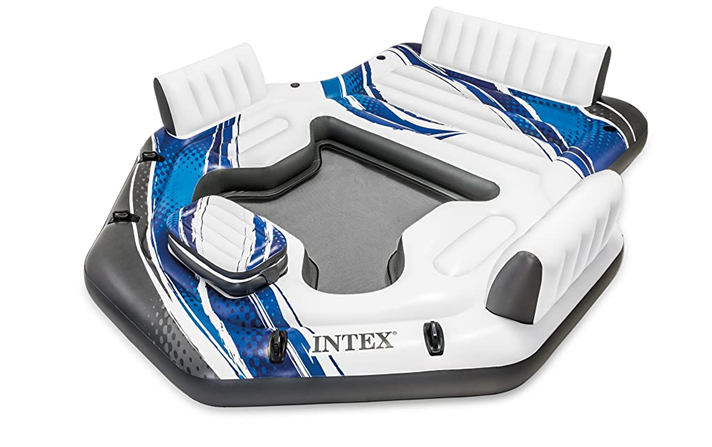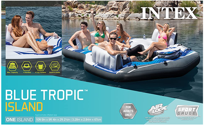 Load up your friends and family and relax on the water with the Blue Tropic Inflatable Water Float from Intex. Your pals will love cracking open a few cold drinks on this raft as you ride the waves of the water. With 4 cup holders and a built-in cooler, you can keep your favorite beverage within reach while the others stay extra chill. Even on the hottest summer days, you're able to remain cool with the mesh floor netting. Featuring 3 backrests, this raft provides maximum comfort as you float in the lake or swimming pool. Quickly inflate the float and be on the water in no time. The heavy-duty handles allow you to climb aboard with ease and ensure simple transportation to and from the water. When not in use, fold the raft for compact storage. Float out and relax for the day with the Blue Tropical Island Floating Raft from Intex.